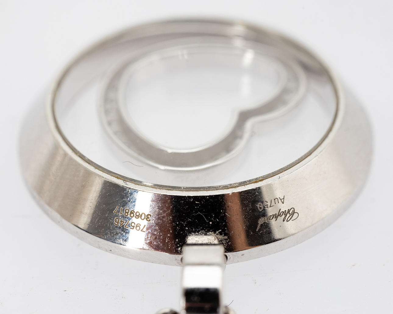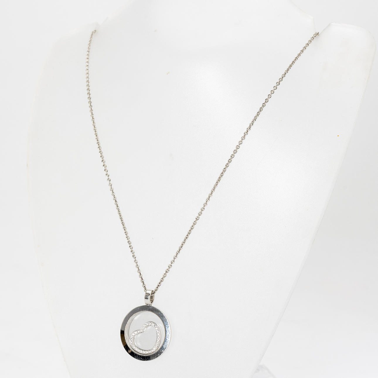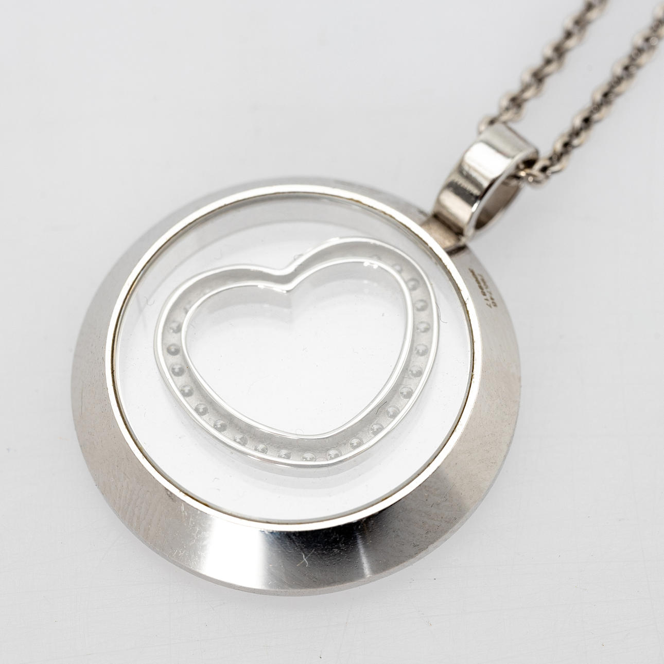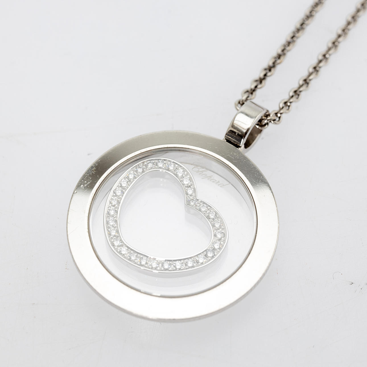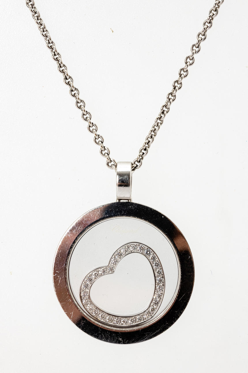 ”CHOPARD” riipus, 750 valkokultaa, ketju 750 valkokultaa (ei Chopard). Mitat n. Riipuksen halkaisija 2,3 cm, ketjun pituus 47 cm.