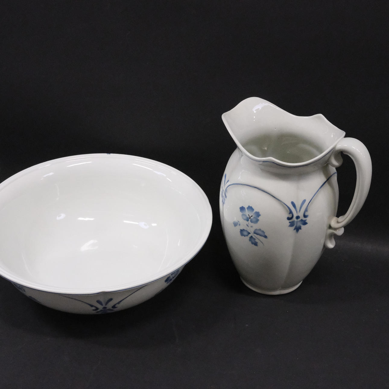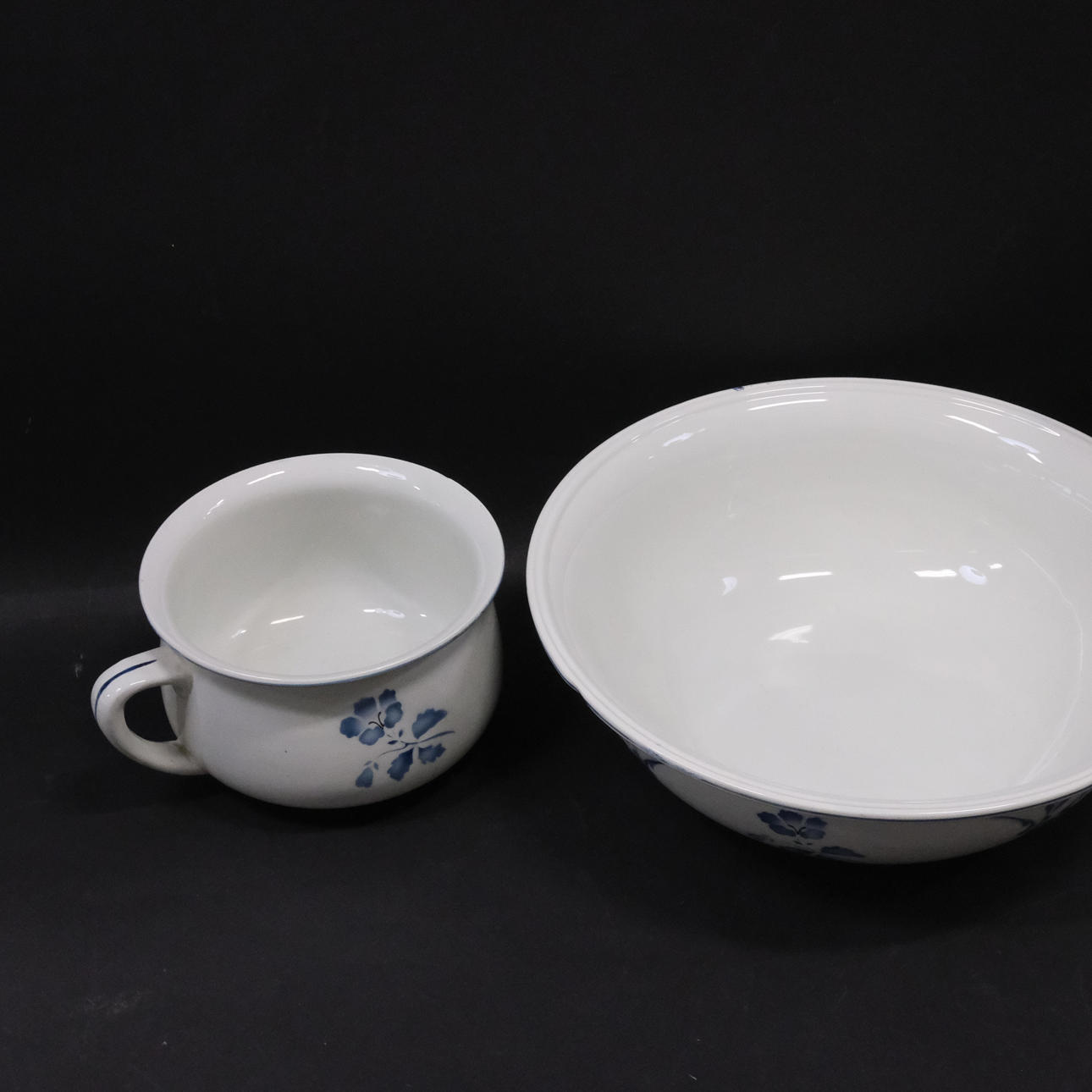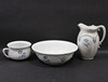 Kannu, korkeus 29,5cm, leveys n. 23cm. Ruukku, korkeus 12cm, leveys 23,5cm. Pesuallas, korkeus 12cm, halkaisija 37cm.