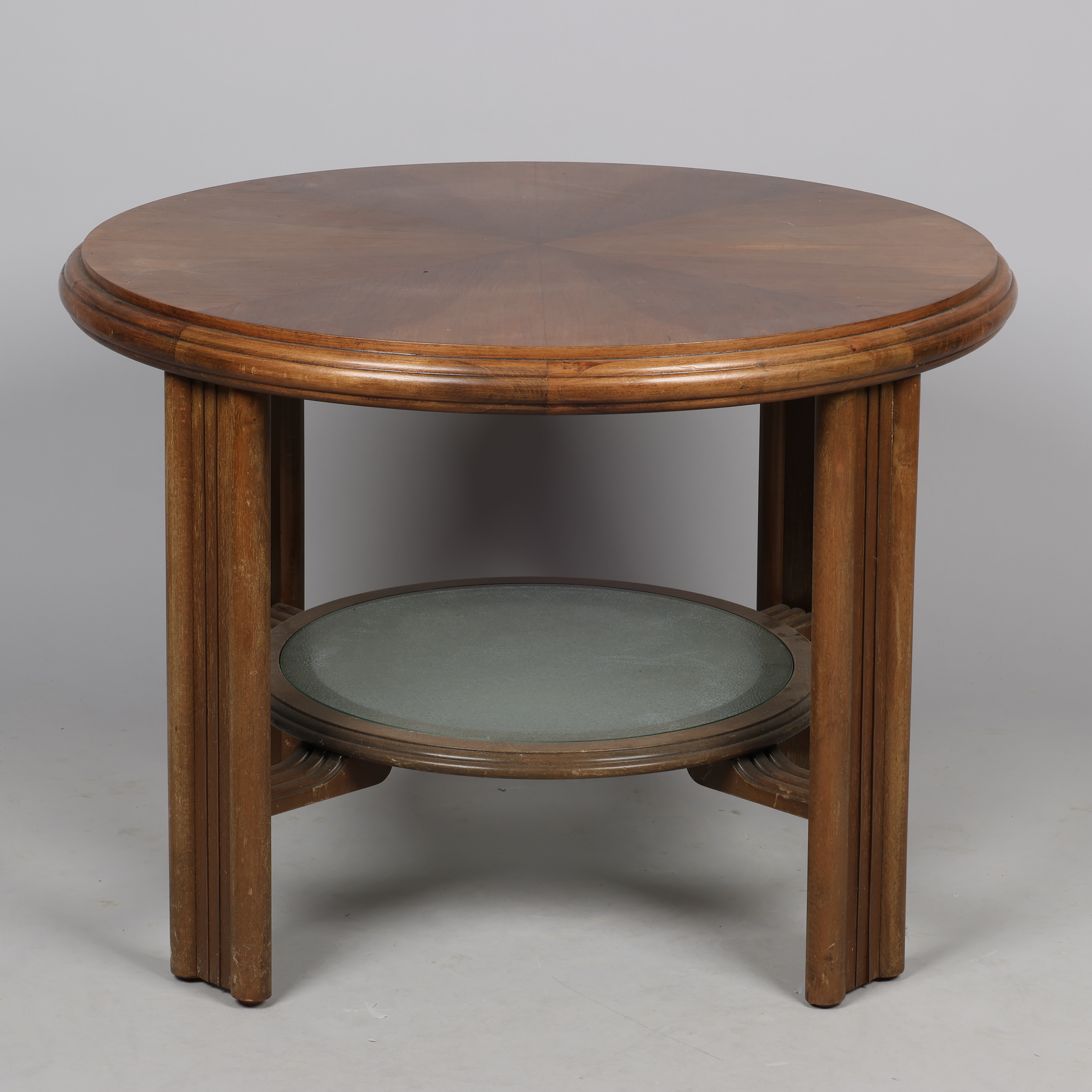 4389080. Pyöreä sohvapöytä, jossa on petsattu pyökkikehys, mahonkiviilupöytä ja alla oleva lasihylly, art deco, eurooppalainen huonekaluvalmistaja, 1900-luvun alkupuoli.