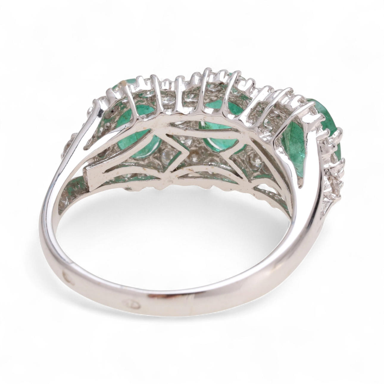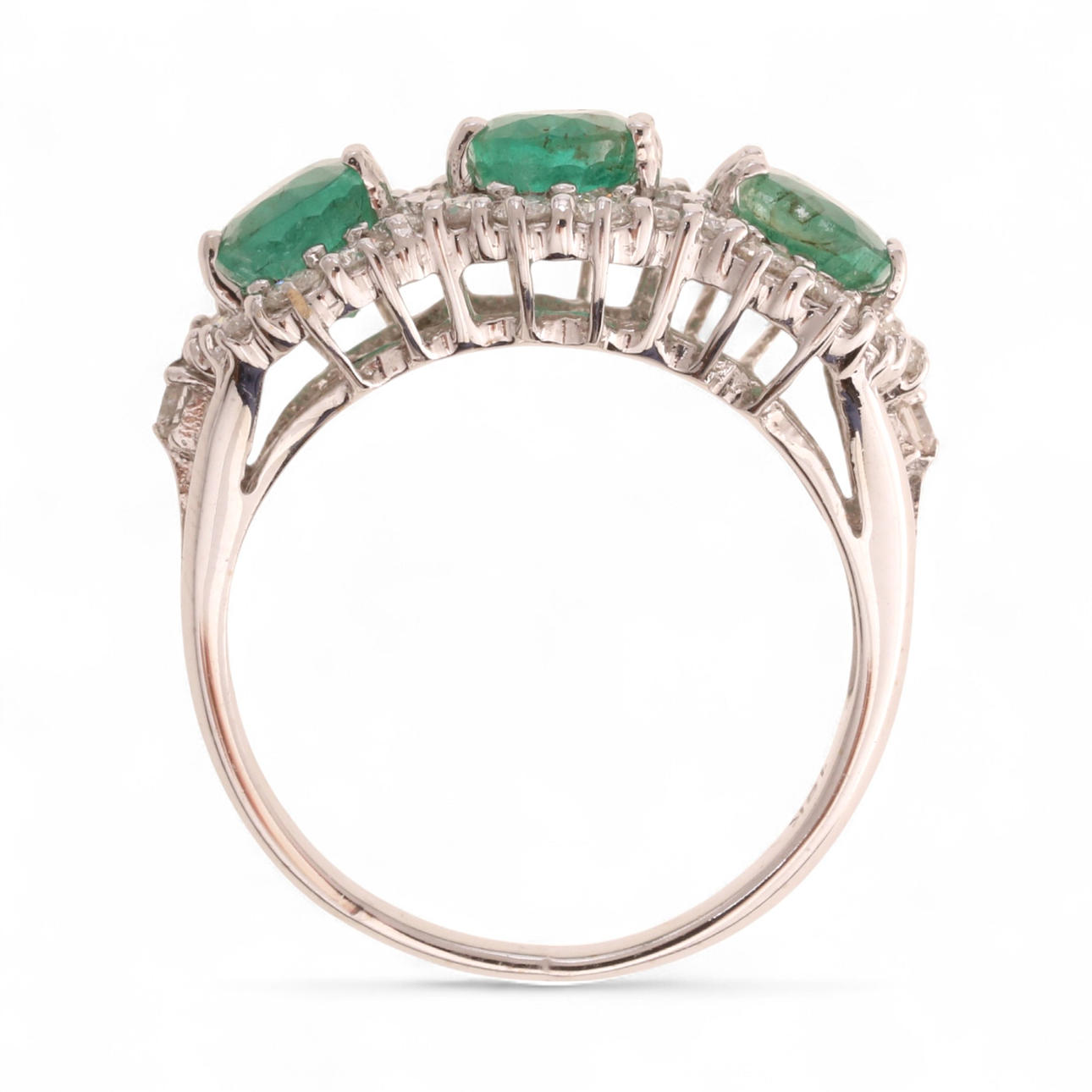 18K valkokultaa, briljantslipade diamanter, ca 0.75 ct. ja soikeita smaragdeja, n. 2,25 ct. Koko 14/54. 4,6 gr.