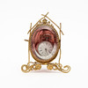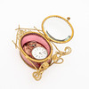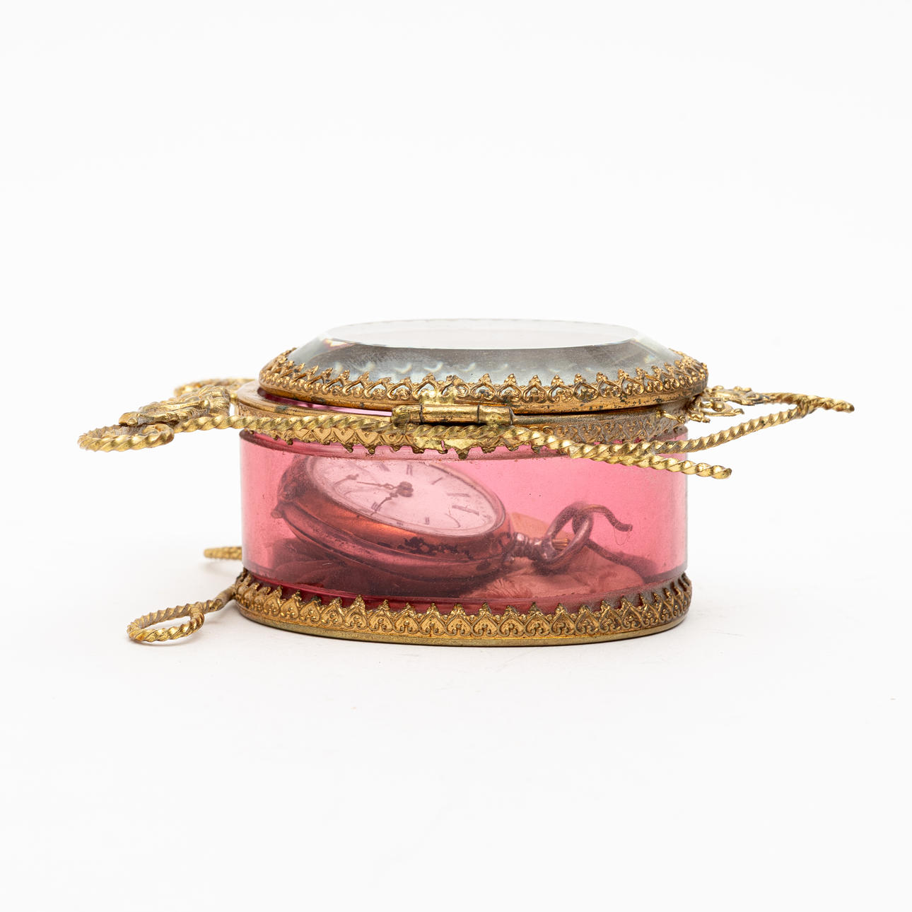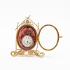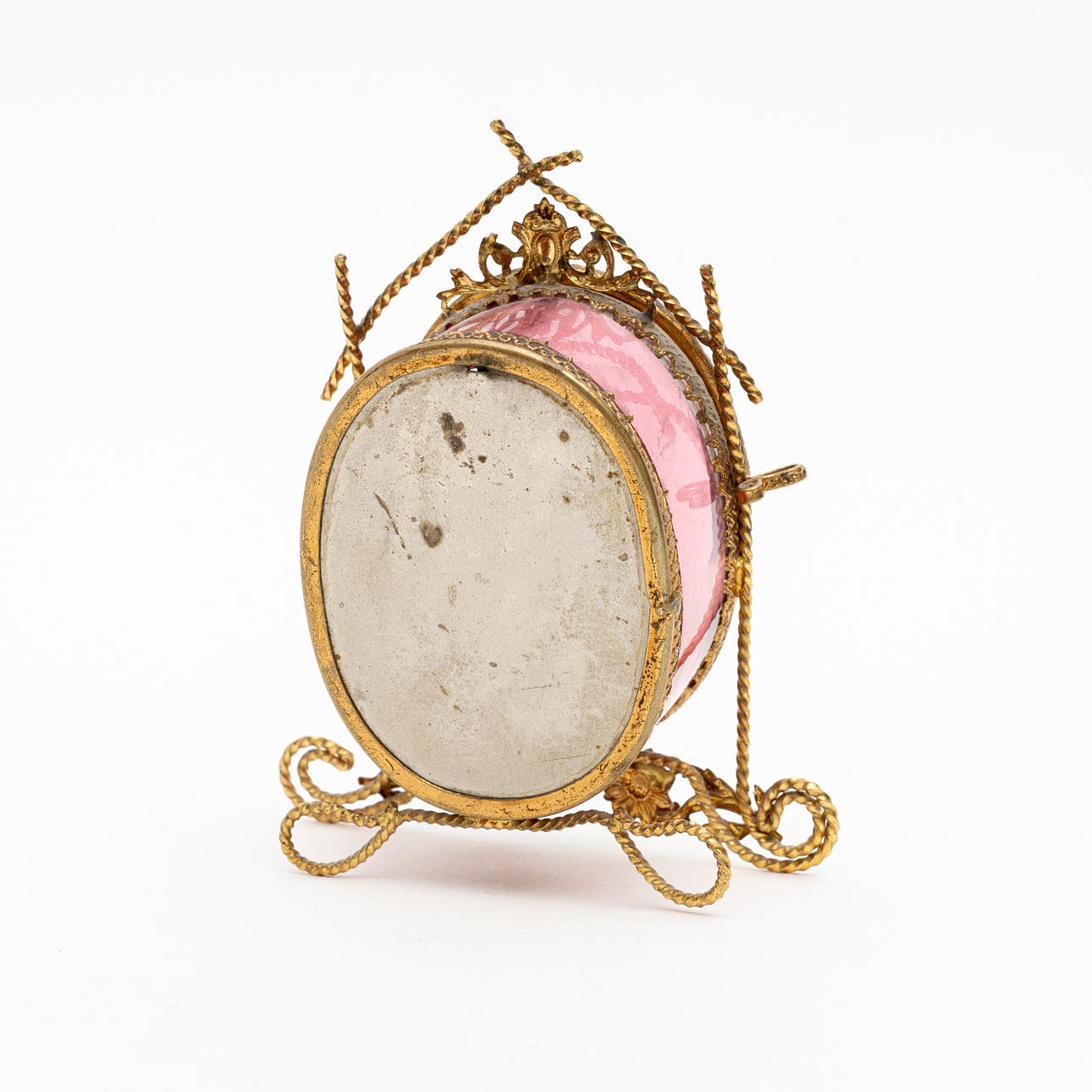 Taskukellon teline, metallia ja lasia, osittain ruusunsävyinen, jalan leveys n. 9, korkeus n. 10,5 cm.