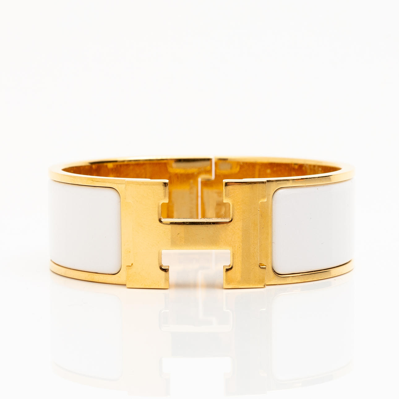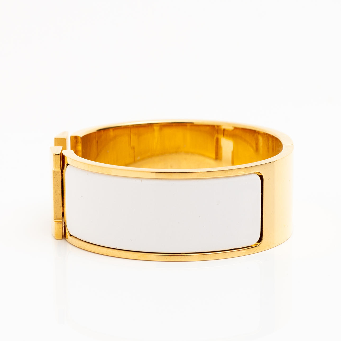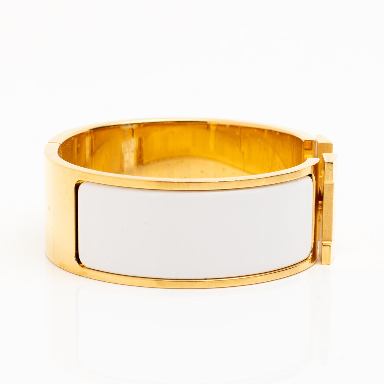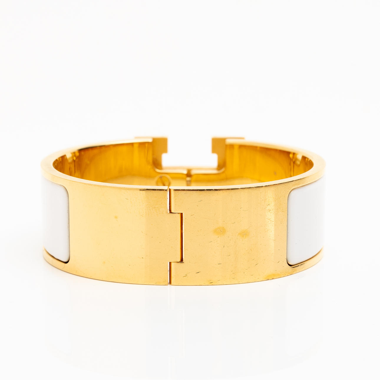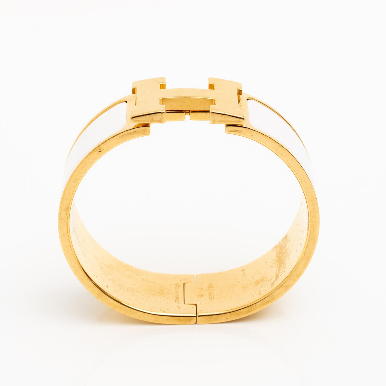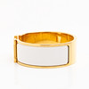 Kullanvärinen metalli valkoisella emalilla. Merkitty ”HERMÈS P MADE IN FRANCE”. Sisäkoko 56 mm x 45 mm (PM). Leveys 2 cm.