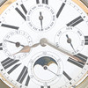 Allekirjoitettu valkoinen kellotaulu roomalaisilla numeroilla ja neljällä toissijaisella valitsimella päivä-, päivämäärä-, sekunti-, kuukausi- ja kuukautiset, kruunukierre, kotelon halkaisija 6,5 cm, punainen nahkakotelo maalaustelineellä, 10 cm leveä, 11 cm korkea.