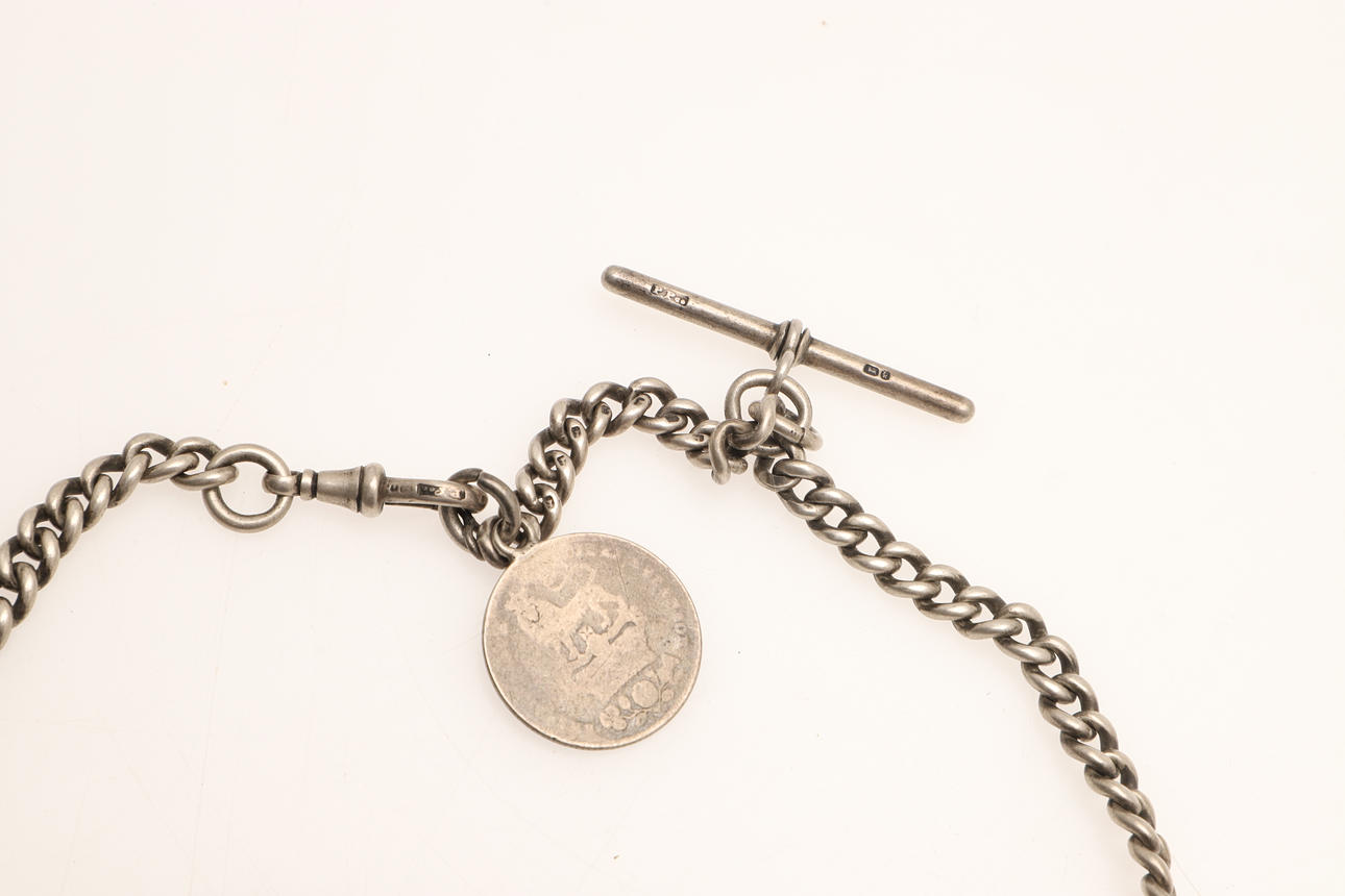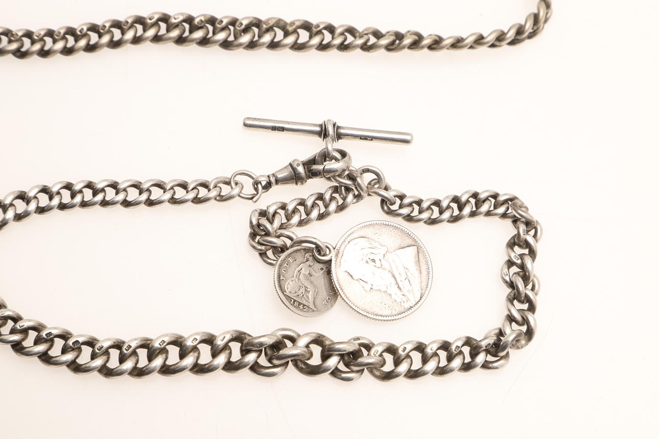 Z. Afrikin hyllyttäminen. Rep. 1 shillingin kappale, 1894, ja englantilainen neljän pennin kappale, 1842, yhdessä toisen hopeisen reunakelloketjun kanssa, kokonaispaino 122,9 grammaa.