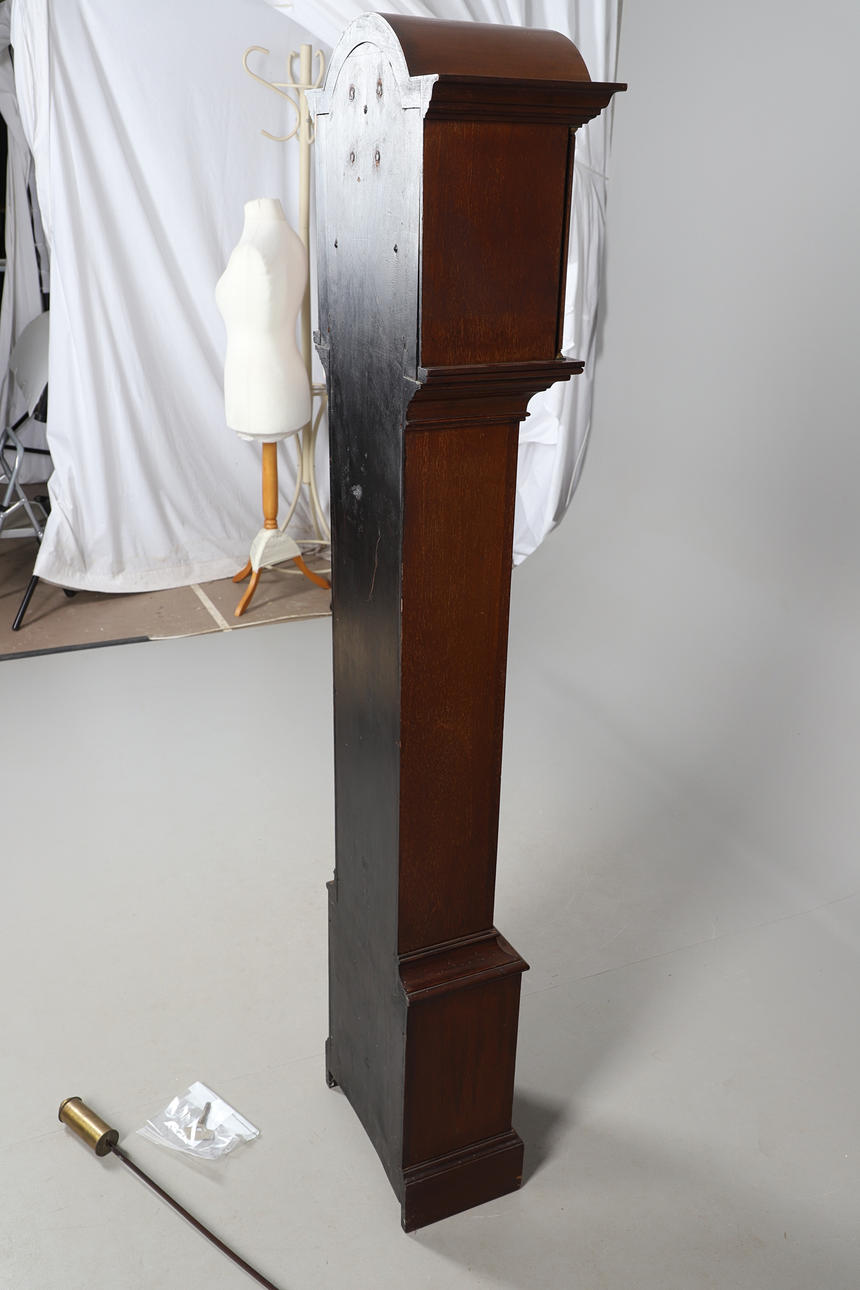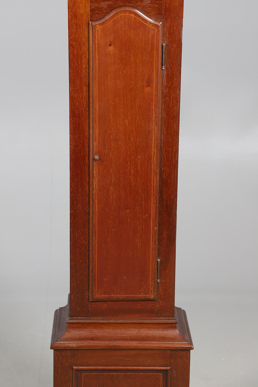 7 1/2" messinkinen kellotaulu signeerattu Tempus Fugit kolmijunaliikkeeseen. Korkeus 159cm. Heilurilla ja avaimella. Ei painoja.