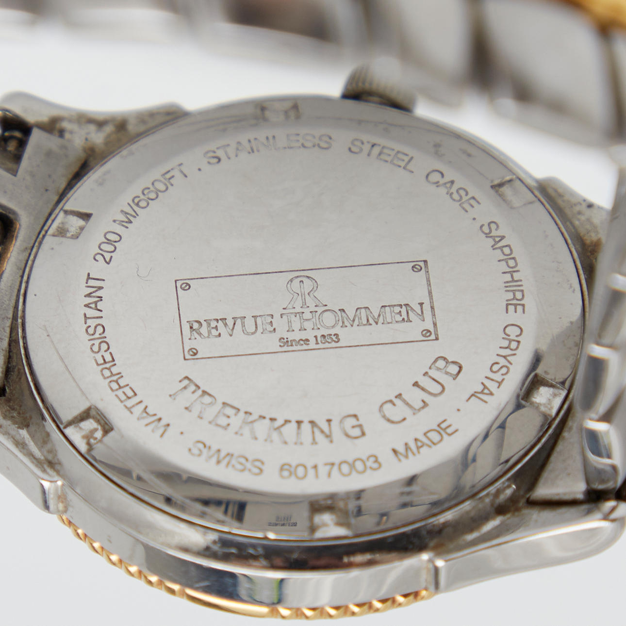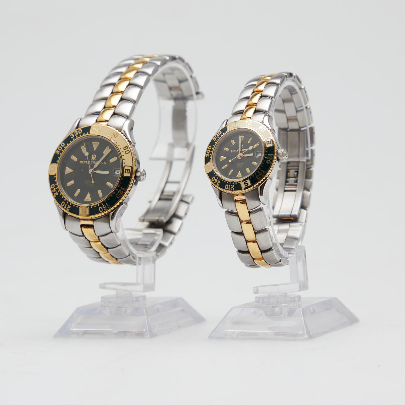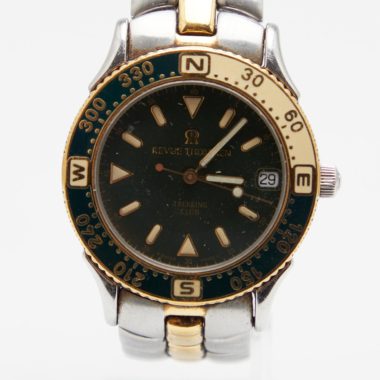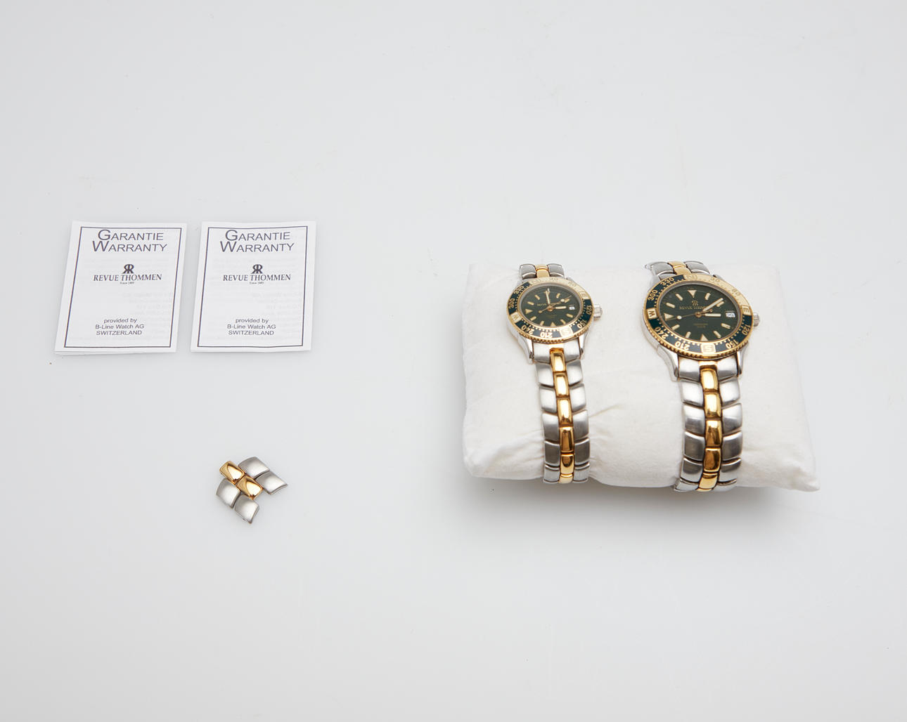 Revue Thommen, rannekellosarja, sveitsiläinen kvartsikoneisto, jokaisessa ruostumattomasta teräksestä valmistettu kotelo, varustettu tummanvihreällä kellotaululla viivaindekseillä, tunti-, minuutti- ja sekuntiosoittimella ja päivämääränäytöllä, kompassi kehyksessä, valmistaja ja mallinimi kellossa, kulta- ja hopeanvärinen ruostumattomasta teräksestä valmistettu rannekoru taitettavalla lukolla, vedenpitävä kotelon takana 20 ATM, kotelon halkaisija: 27-34,2 mm, rannekkeen pituus: 17-18,5 cm, leveys: 14-18 mm, kellorasiassa. (2).