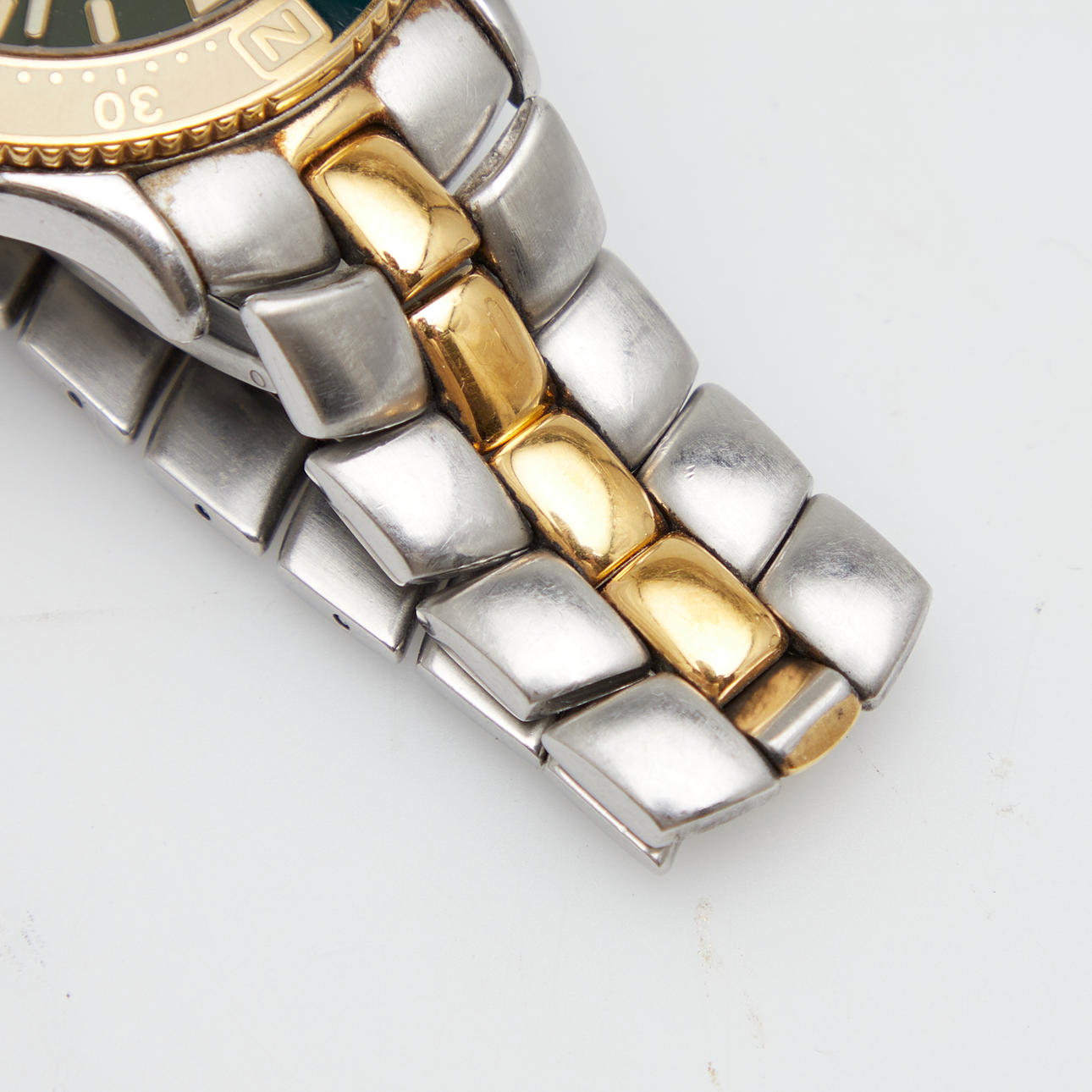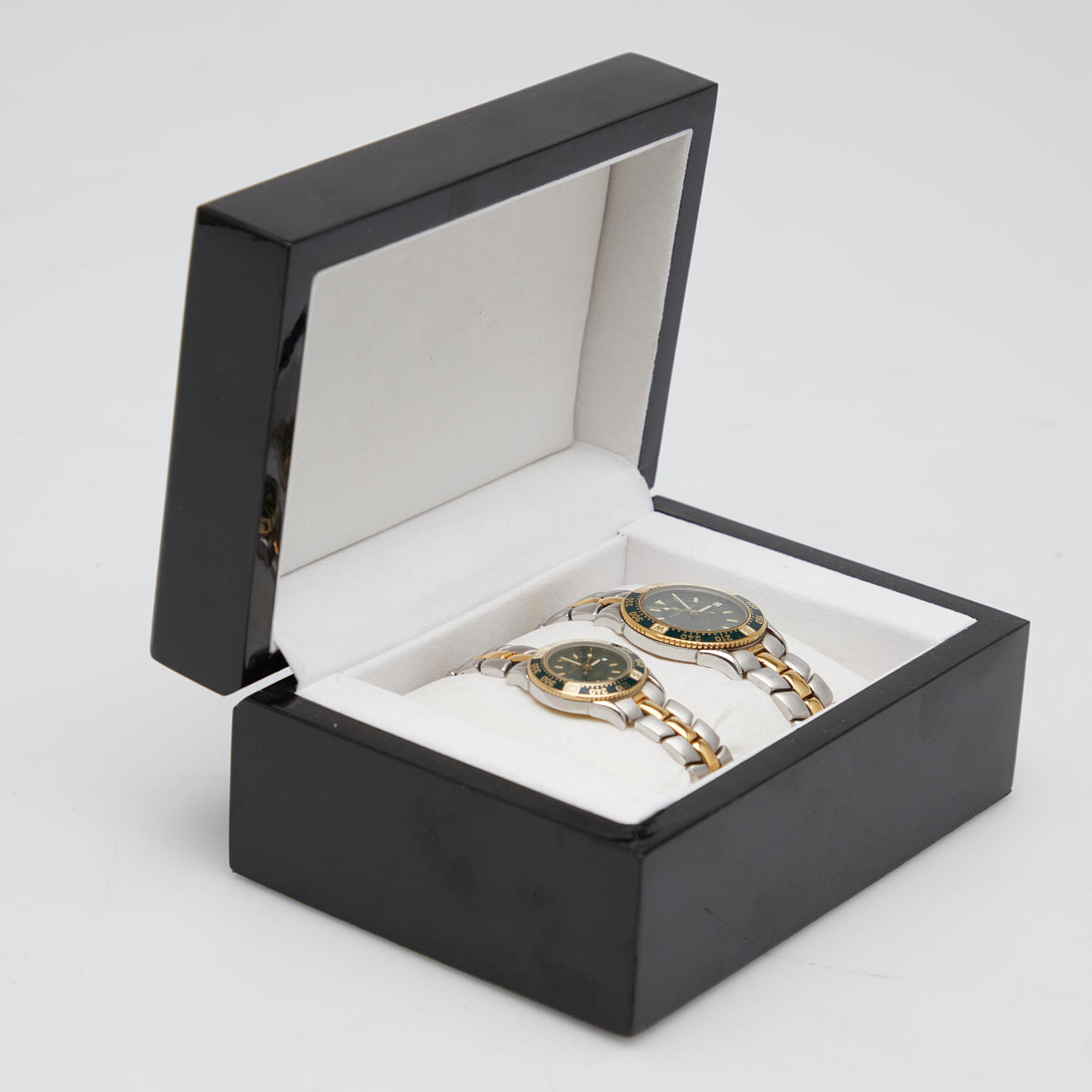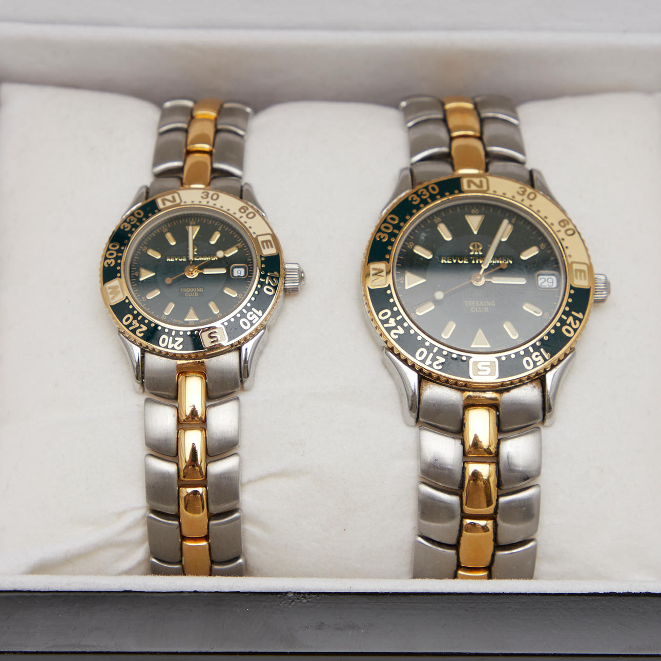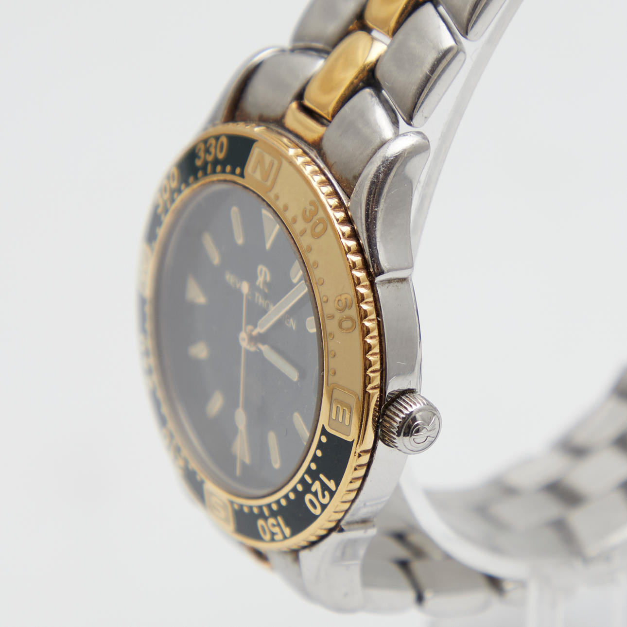 Revue Thommen, rannekellosarja, sveitsiläinen kvartsikoneisto, jokaisessa ruostumattomasta teräksestä valmistettu kotelo, varustettu tummanvihreällä kellotaululla viivaindekseillä, tunti-, minuutti- ja sekuntiosoittimella ja päivämääränäytöllä, kompassi kehyksessä, valmistaja ja mallinimi kellossa, kulta- ja hopeanvärinen ruostumattomasta teräksestä valmistettu rannekoru taitettavalla lukolla, vedenpitävä kotelon takana 20 ATM, kotelon halkaisija: 27-34,2 mm, rannekkeen pituus: 17-18,5 cm, leveys: 14-18 mm, kellorasiassa. (2).