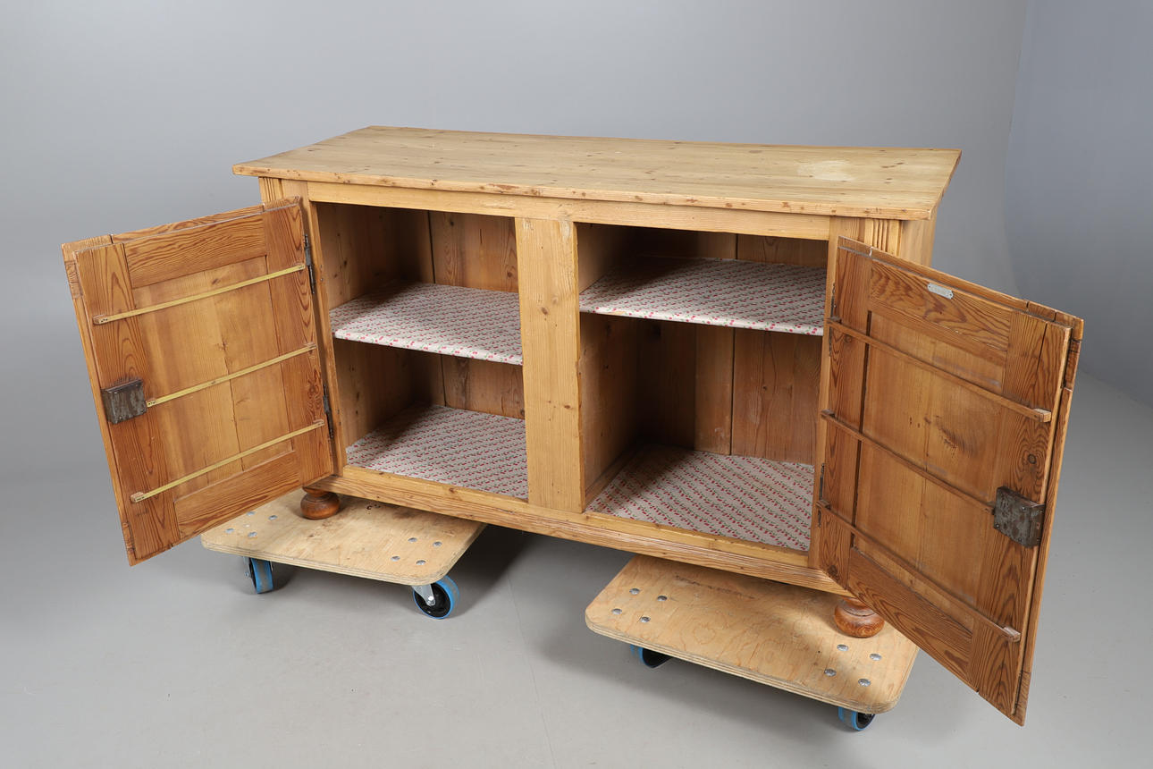 Kaksiovinen kaappi, jossa 2 eri korkeutta sisätiloihin asennettua hyllyä. Yksipaneeliset ovet, joissa metalliset saranat. Nostettu etupullajalkoihin. Lukittava avaimella. Korkeus 80cm, pituus 136cm, syvyys 50cm.
