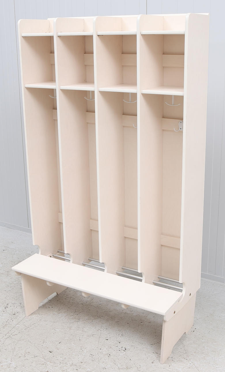 Neljä lokeroa, joissa kummassakin kaksi kaksinkertaista ripustimia, hattuhylly ja kenkäteline. Istuinpenkki.