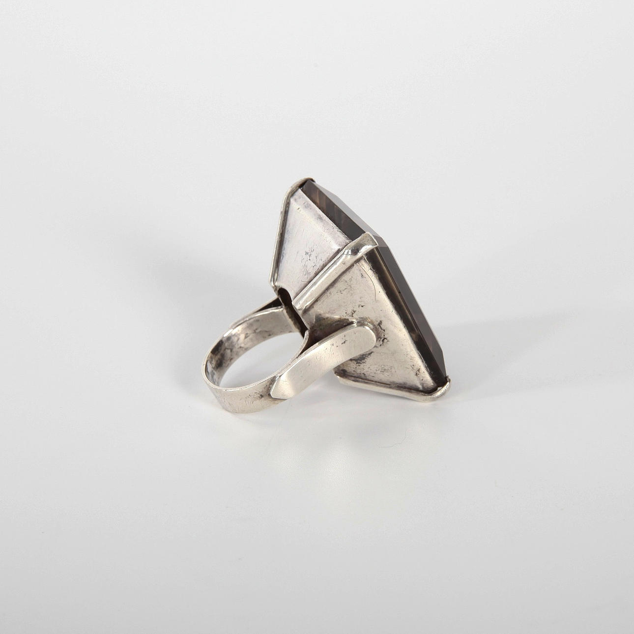 Hopeinen sormus kahdeksankulmion muotoisella savukvartsilla n. 155ct. (Kiven mitat noin 35,4x29,7x17,5 mm)