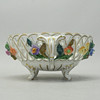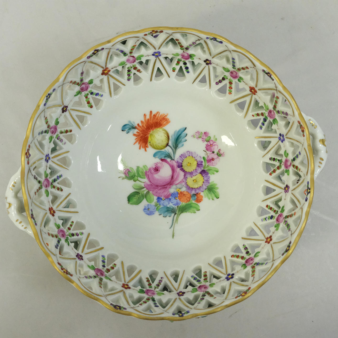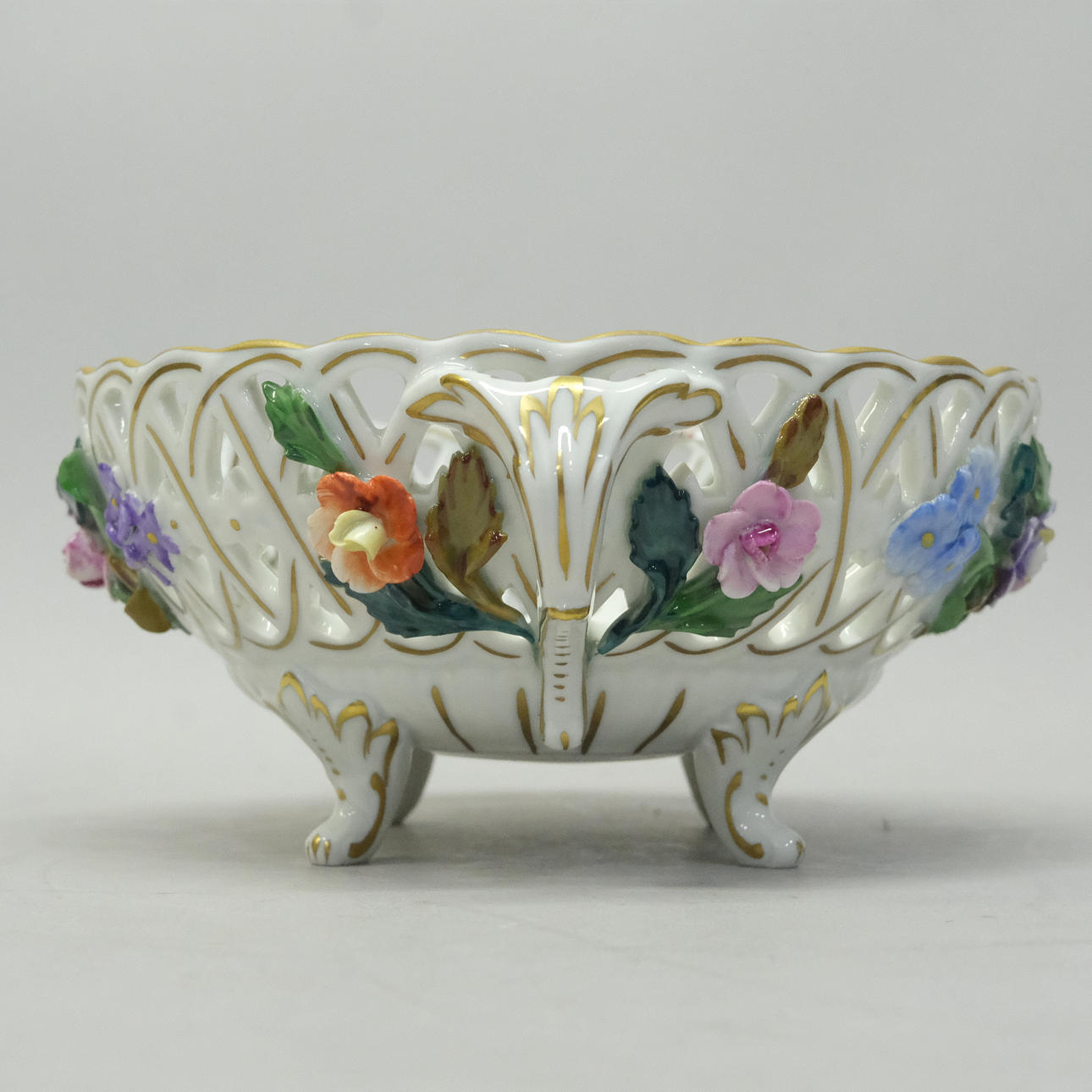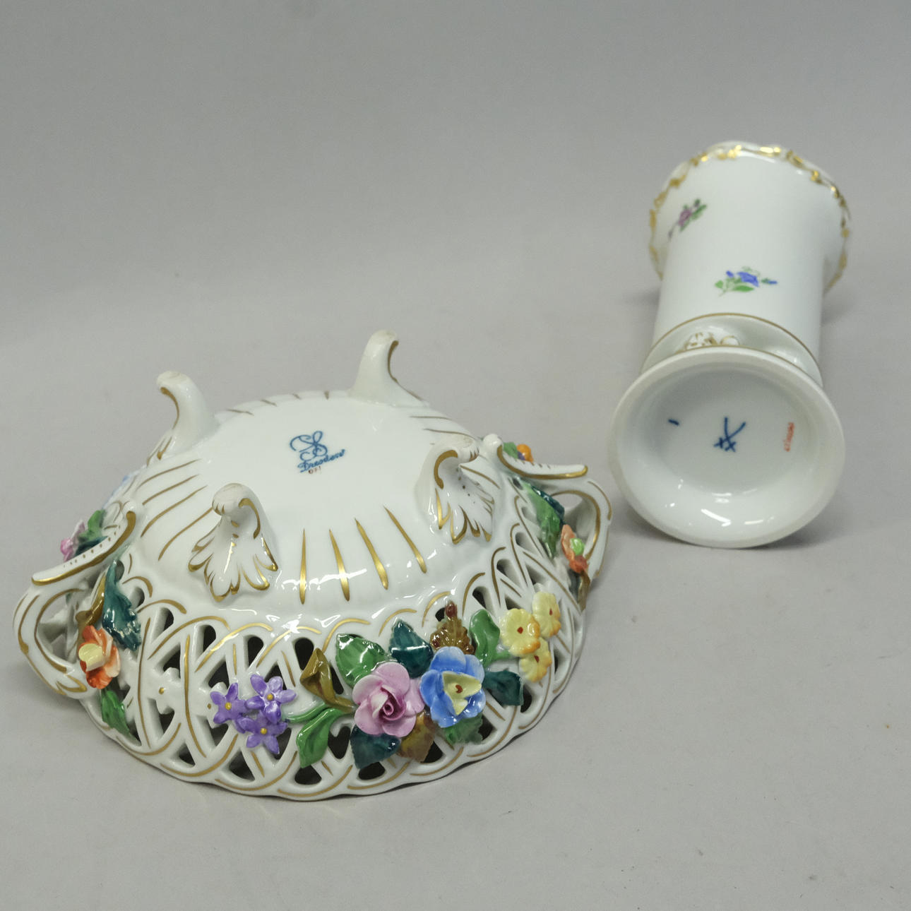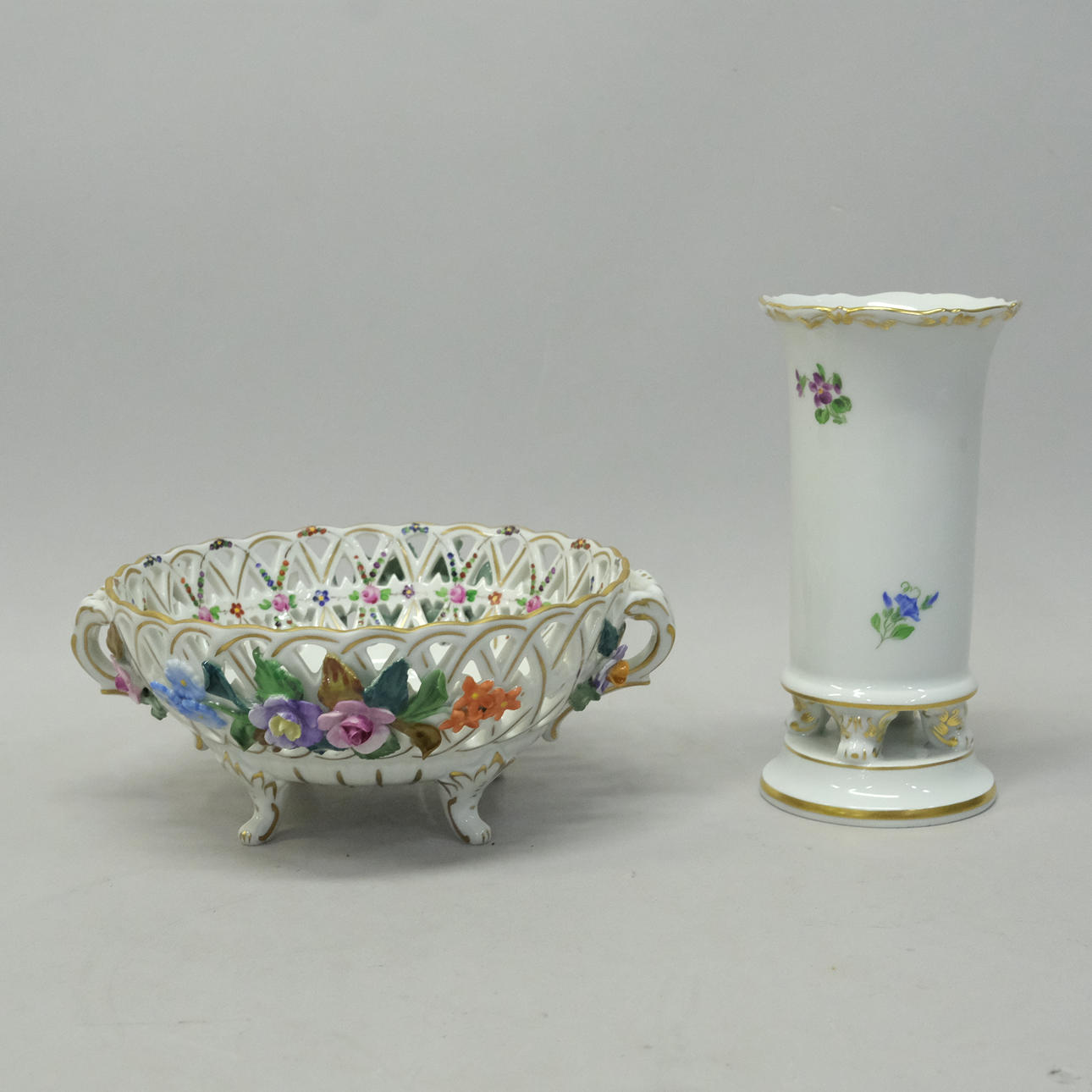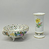 1 maljakko, Meissen, posliini, maalaus kuvaa kukkakimppua narsissilla, korkeus 15 cm ja harjakulho, Dresden, neljällä jalalla ja muovisella koristeella maalattuja kukkia, leveys 17,5 cm.