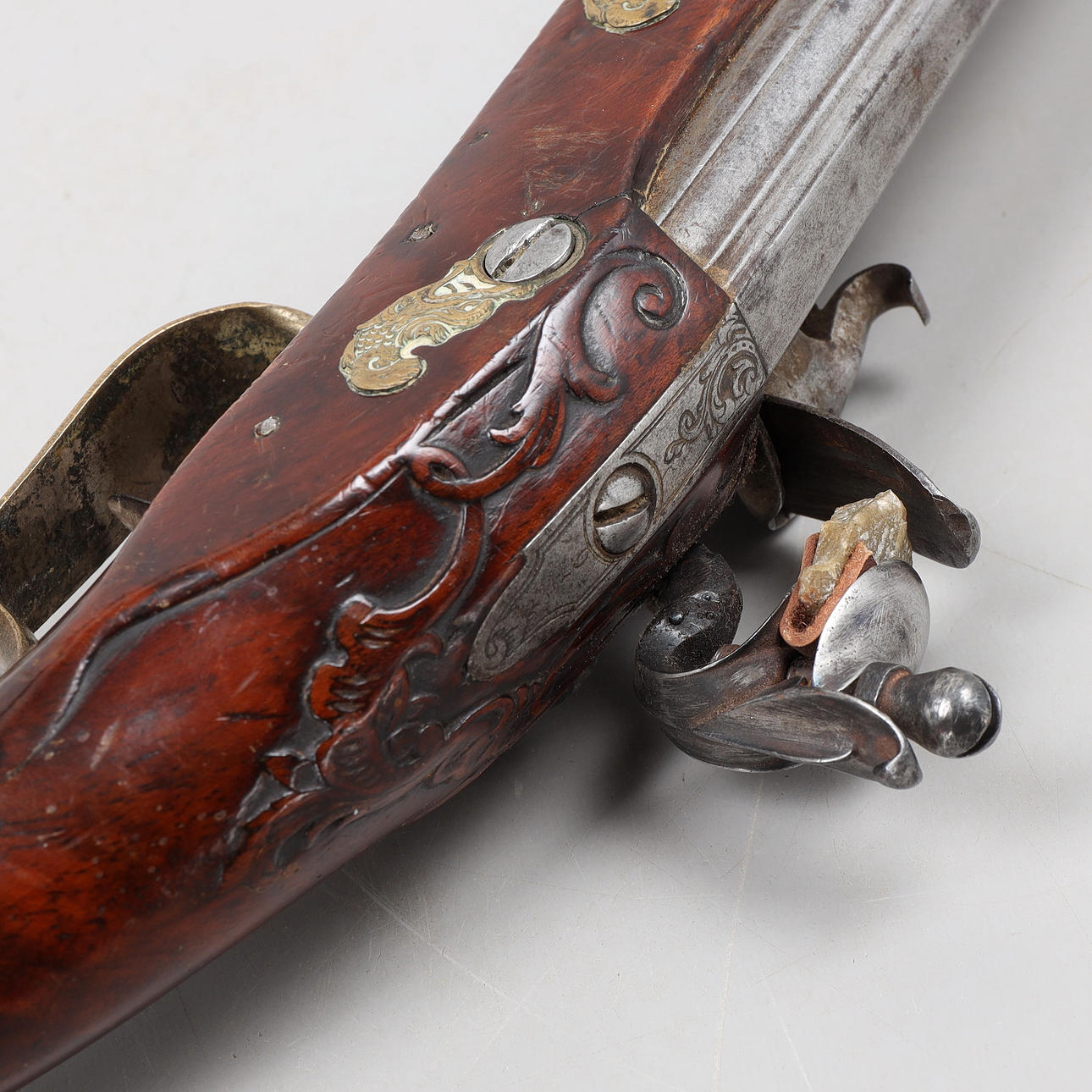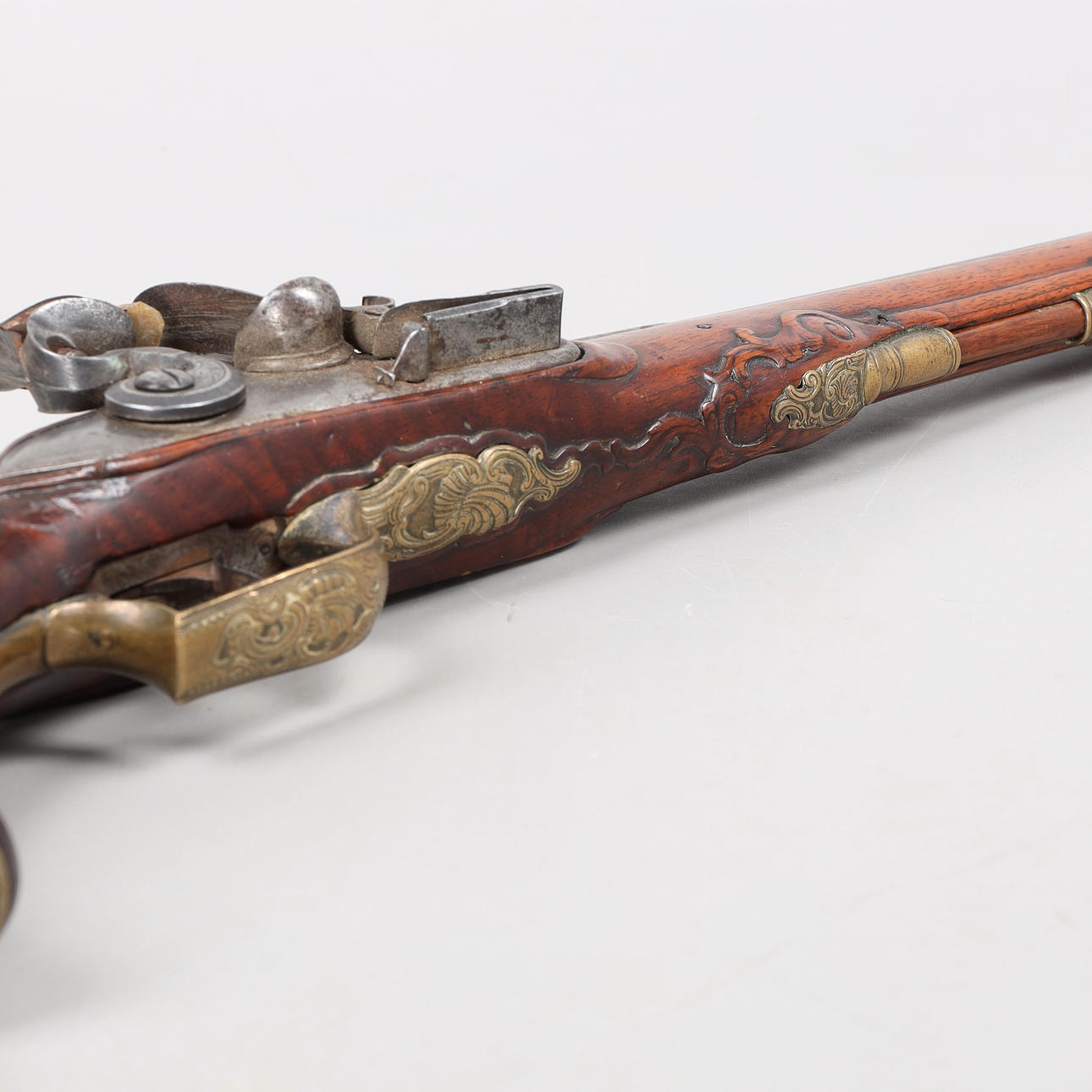 Koristellut messinkivarusteet. Kahdeksankulmainen kammiokappale. Pituus 40,5 cm. Tynnyrin sisähalkaisija 15 mm.