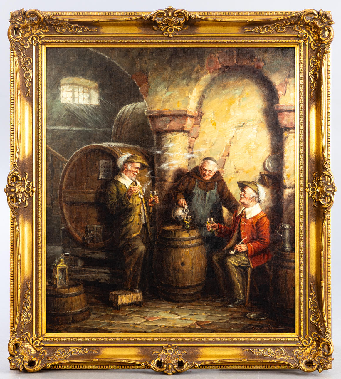 Hein van Doren (1930-2003), Viinikellarissa, signeerattu, ca. 80 x 70 cm, stukkokehyksellä n. 99 x 89 cm.