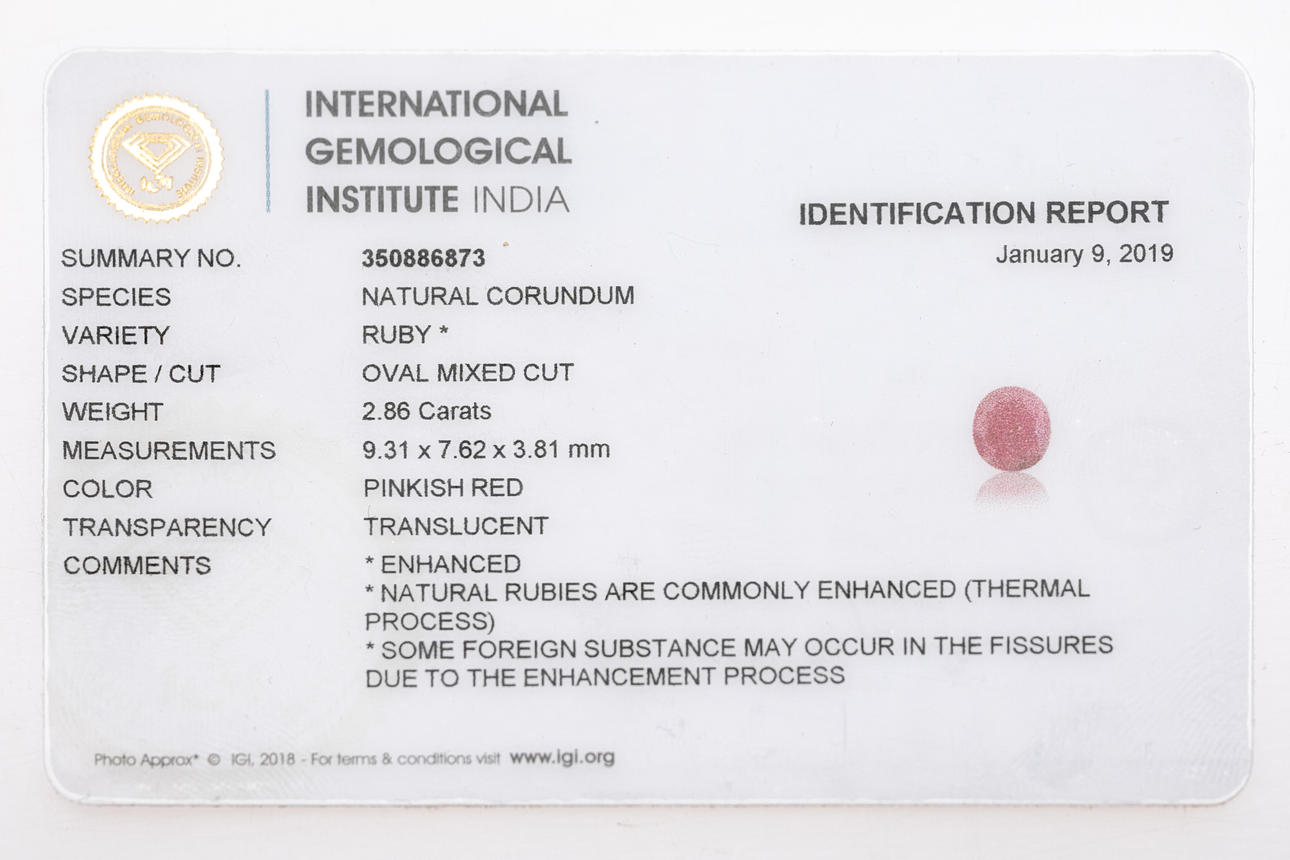 Luonnollinen rubiini, leikkaus: soikea sekaleikkaus, mitat n. 9,31 x 7,62 x 3,81 mm Paino: n. 2,86 ct. Sisältää todistuksen.