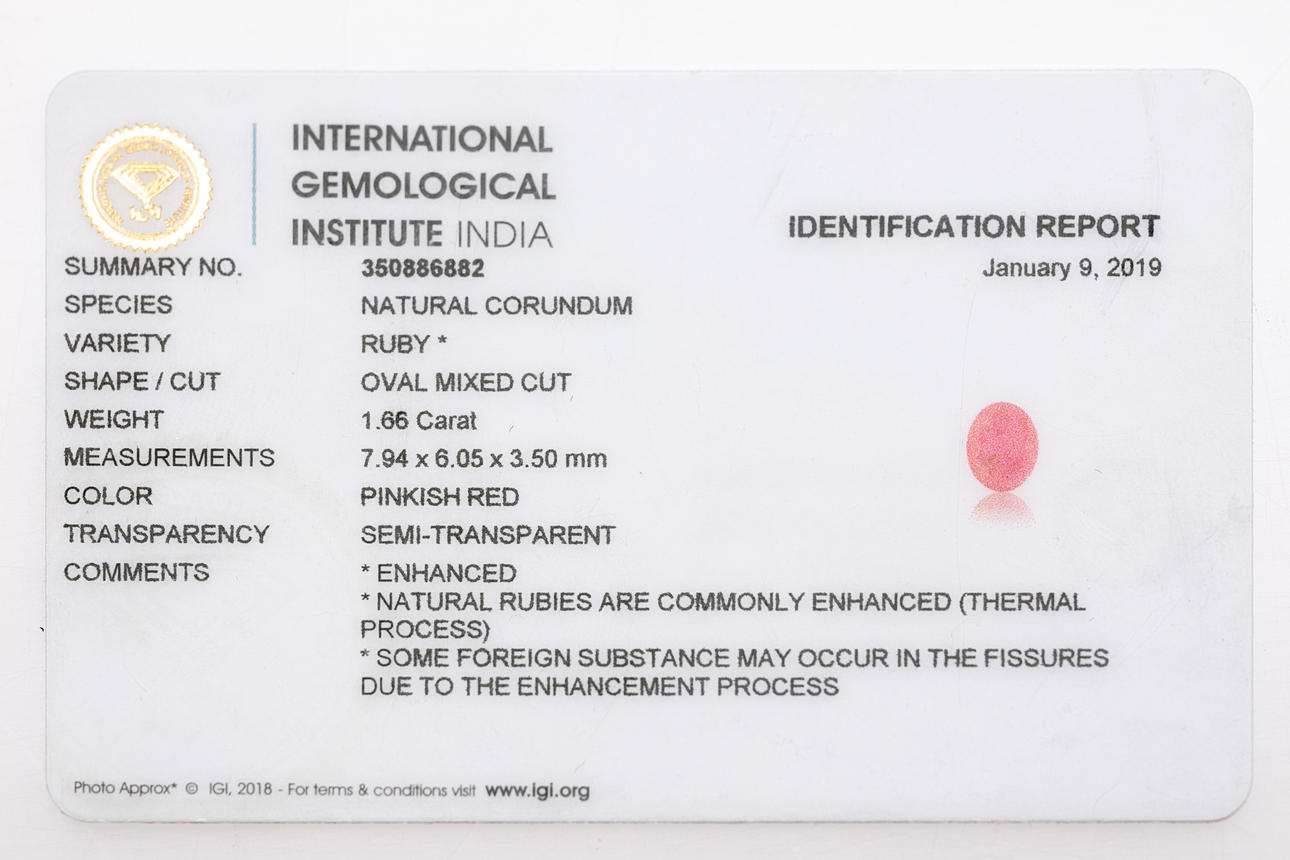 Luonnollinen rubiini, leikkaus: soikea sekaleikkaus, mitat n. 7,94 x 6,05 x 3,50 mm Paino: n. 1,66 ct. Sisältää todistuksen.