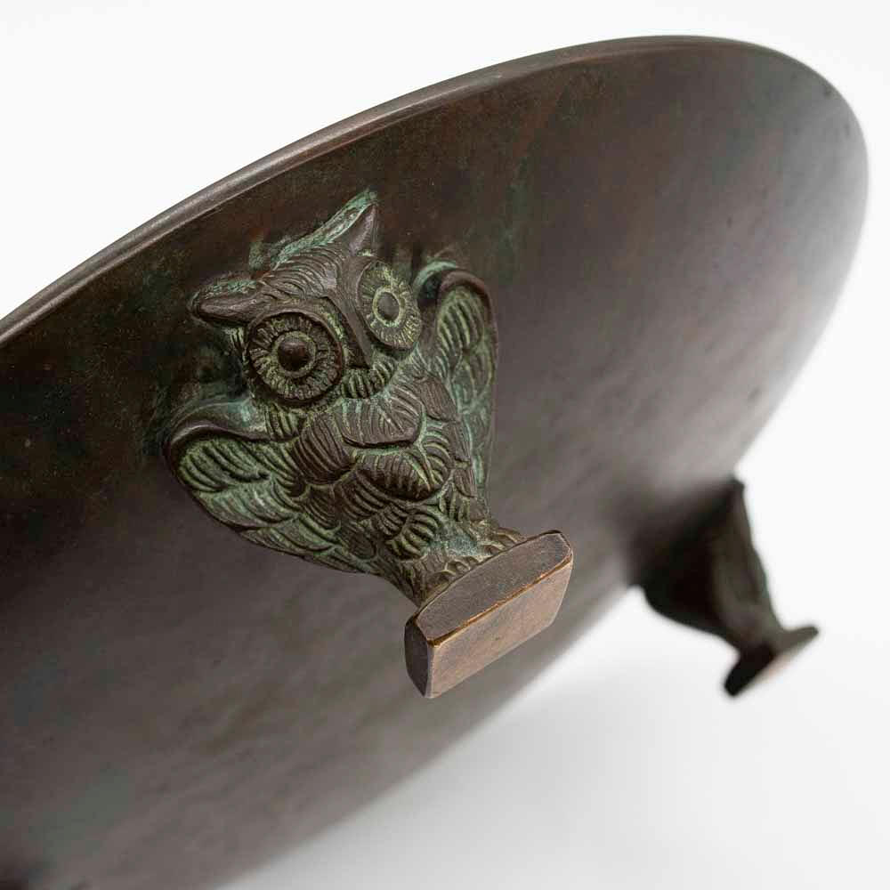 Pronssilevy, jonka jalat kuvaavat pöllöjä.