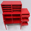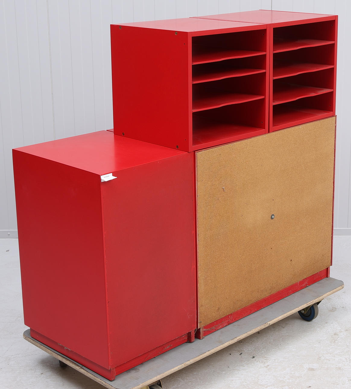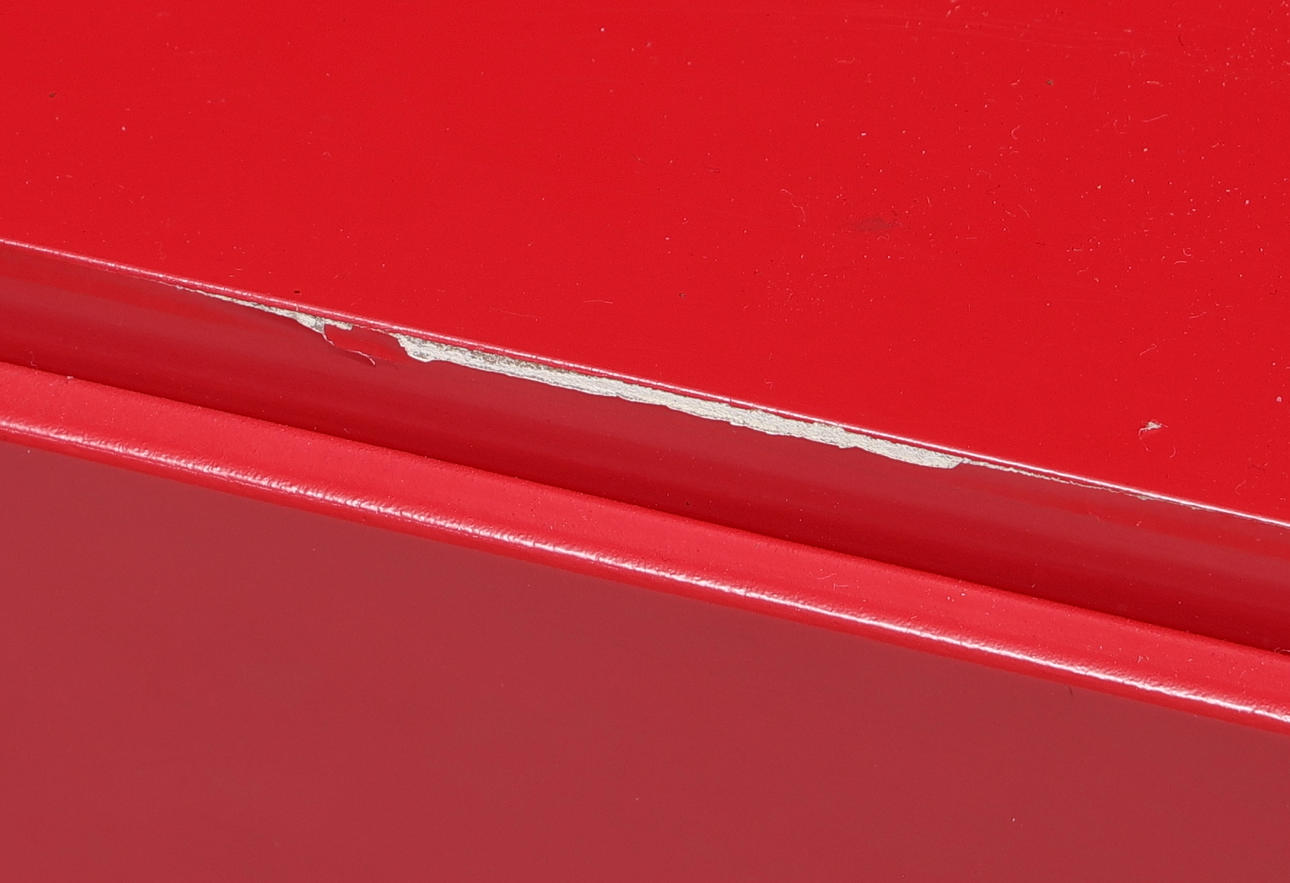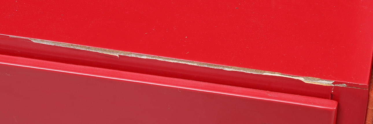 Käyttöehdot. Pinta-lika. Hankauksia, tahroja ja jälkiä. Edessä osittain löysä laatikossa hurtsenissa. Osittain naarmuuntunut lakka kaapin reunoissa ja että hyllystä puuttuu hyllyteline. Kaapin sivuilla olevat tarraräännökset sekä yksi asiakirjojen keräilijöistä. Auringonvalkaistu.