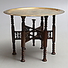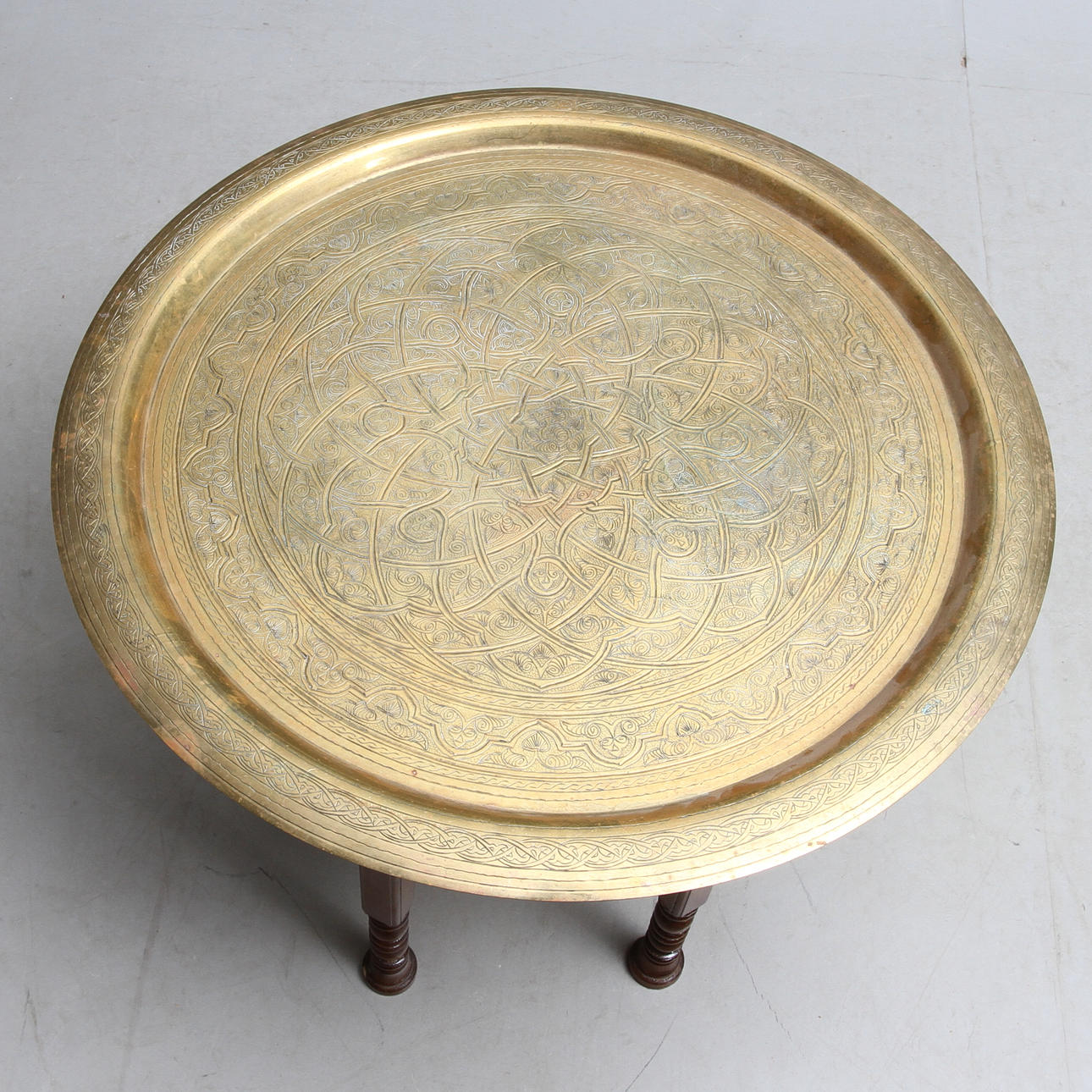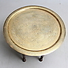 Löysä levy messinkiä. Kokoontaitettava alavaunu. Halkaisija 64,5, korkeus n. 49 cm.
