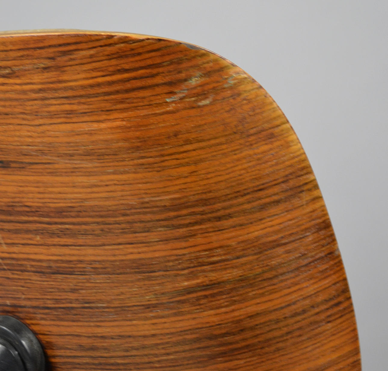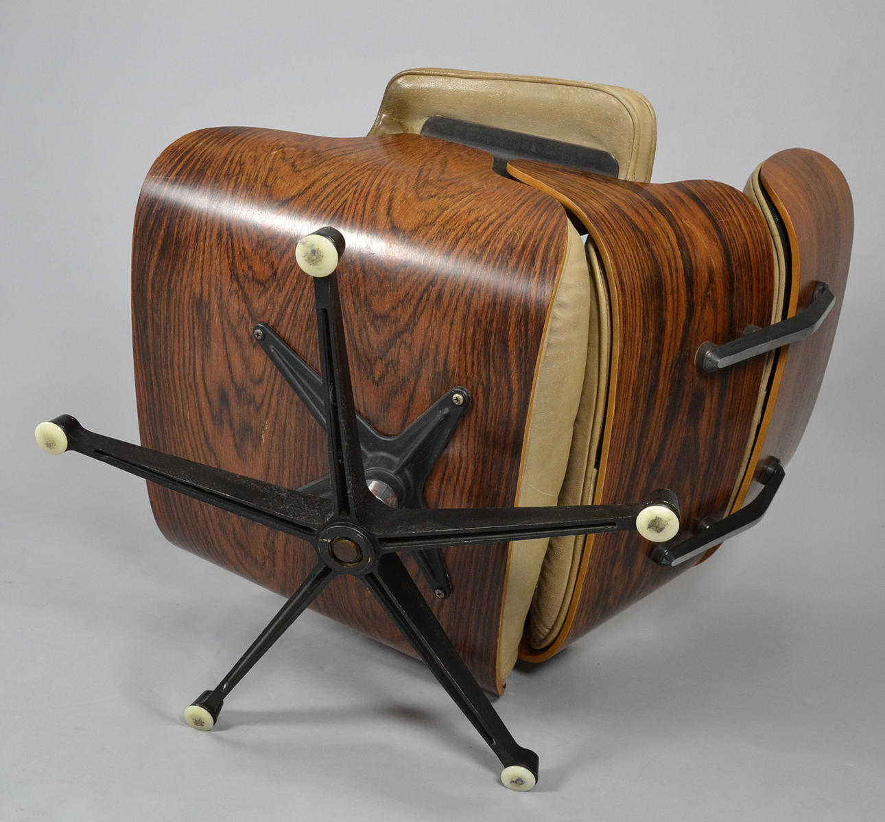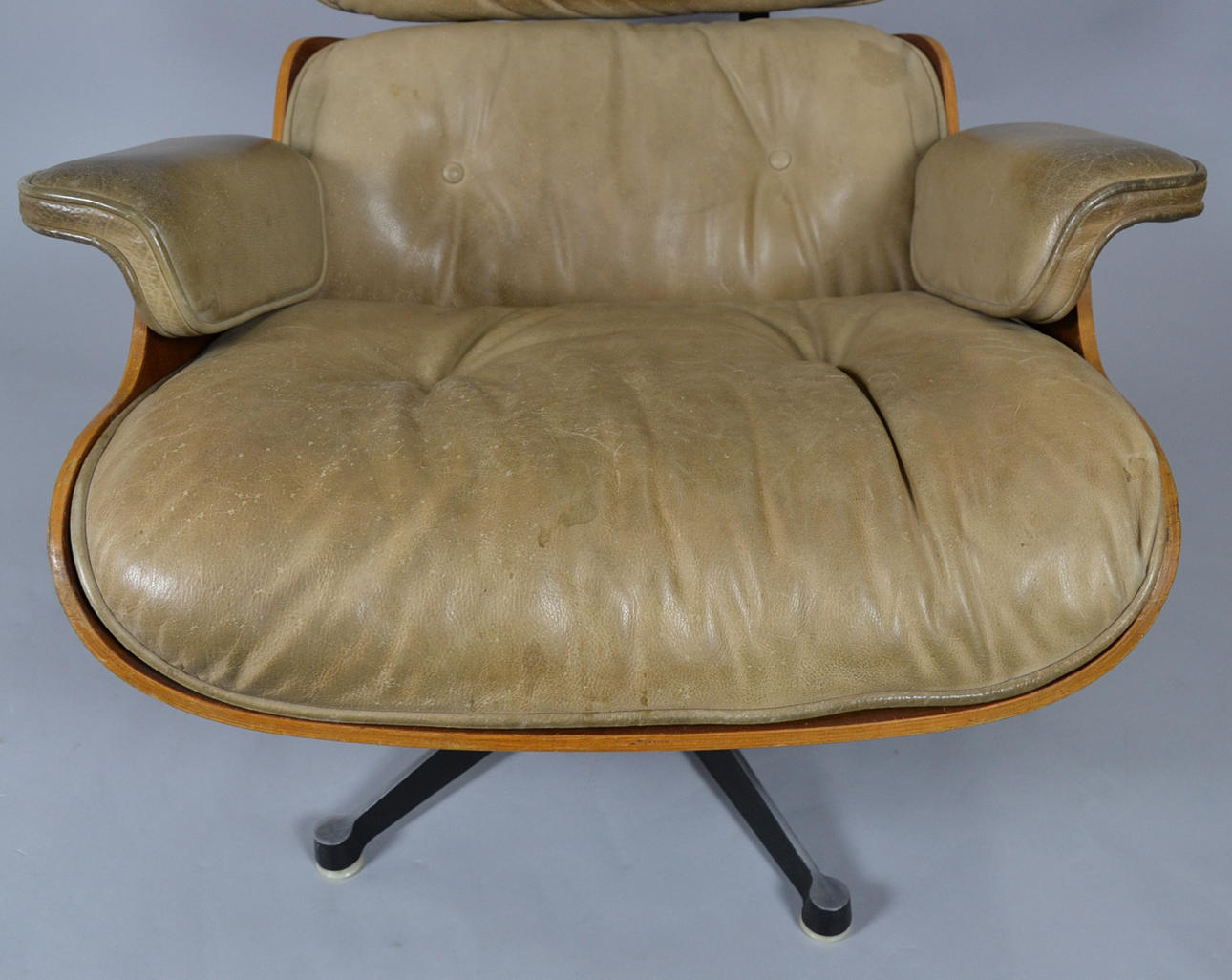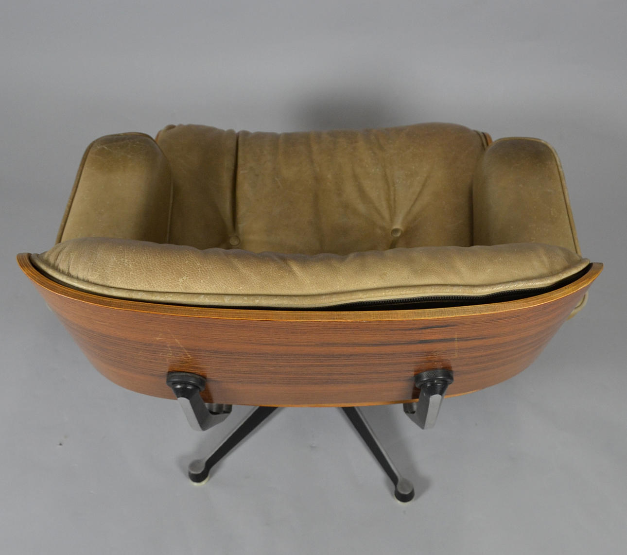 Suunnittelu: Charles & Ray Eames vuodelta 1956 Valmistaja: Vitra (merkitsemätön) Versio n. 1970-luvun kääntyvä alumiinirunko vanerikuorilla. Irrotettavat pehmusteet paksua ruskeaa nahkaa.