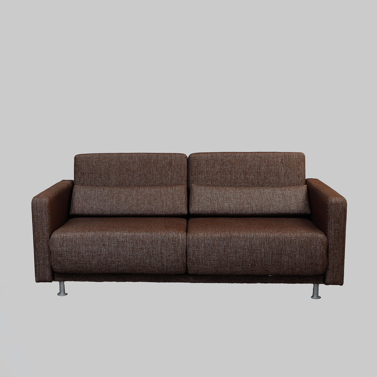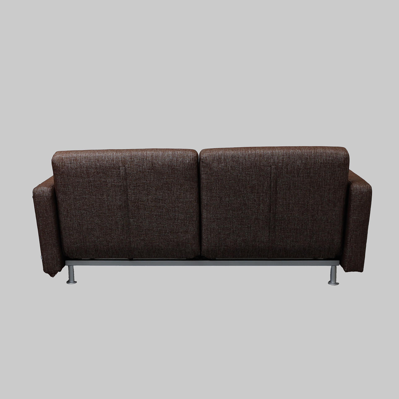 Verhoiltu ruskealla melange-kankaalla, kromatut jalat. Merkitty. Pituus n. 175 cm, syvyys 85 cm, korkeus 75 cm.
