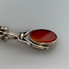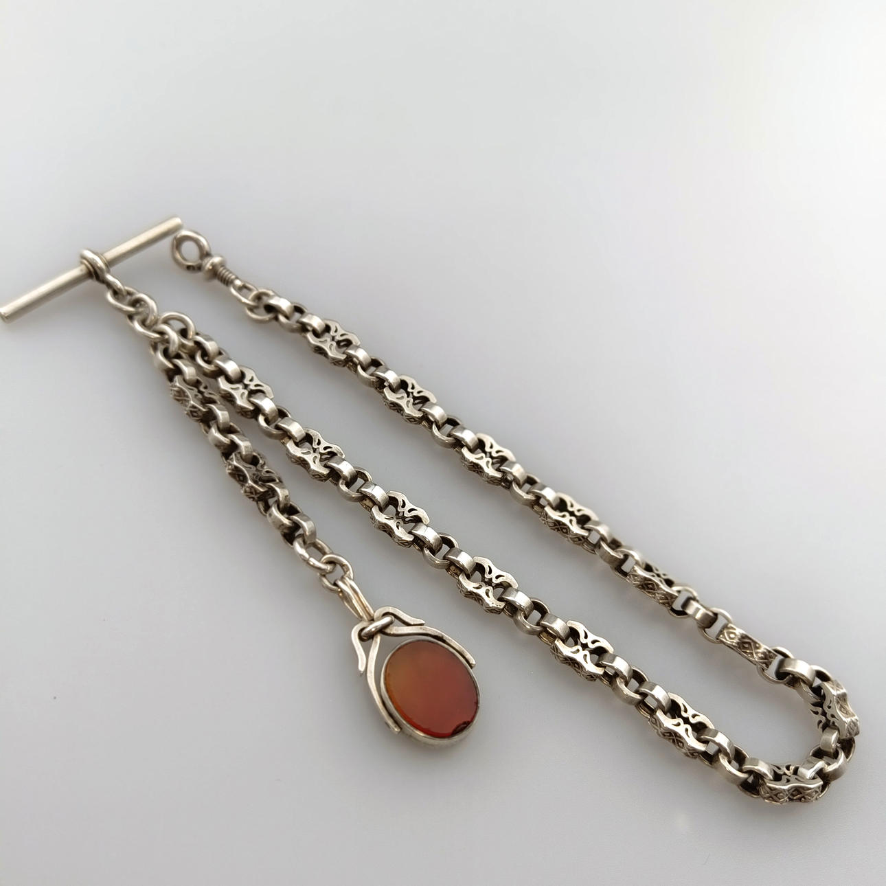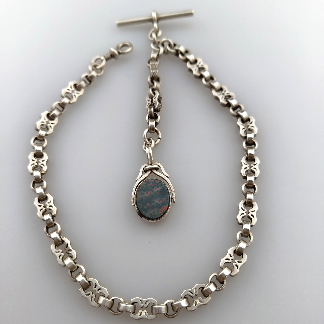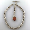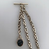 Taskukelloketju chatelaiinilla - hopeaketju, jossa chatelaine soikean pyörivän medaljonin muodossa, kivet molemmin puolin, kokonaispituus noin 39 cm, paino n. 31,5 g.
