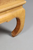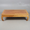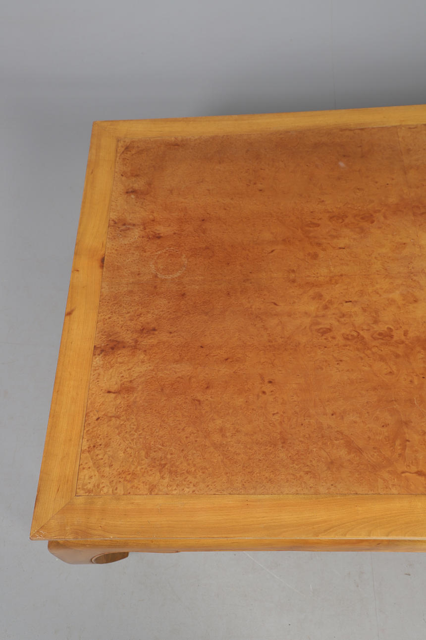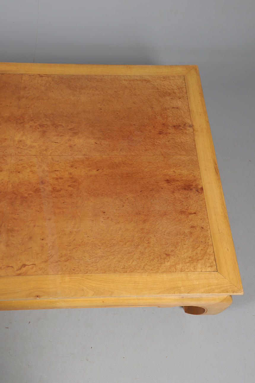 Suurikokoinen, puristettu puun yläosa neljään neljännekseen ja tuettu lyhyillä kaarevilla jaloilla. Huippu 134 cm x 91 cm, korkeus 36 cm.