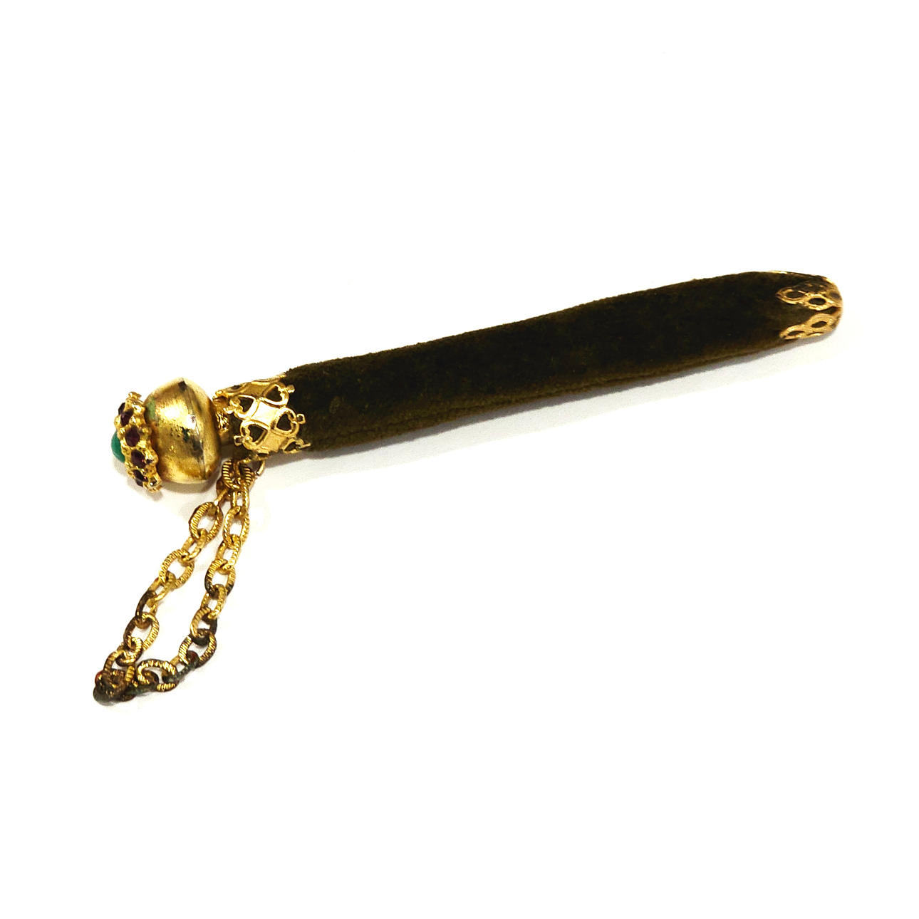 Kultainen metallikynä samettikannella.