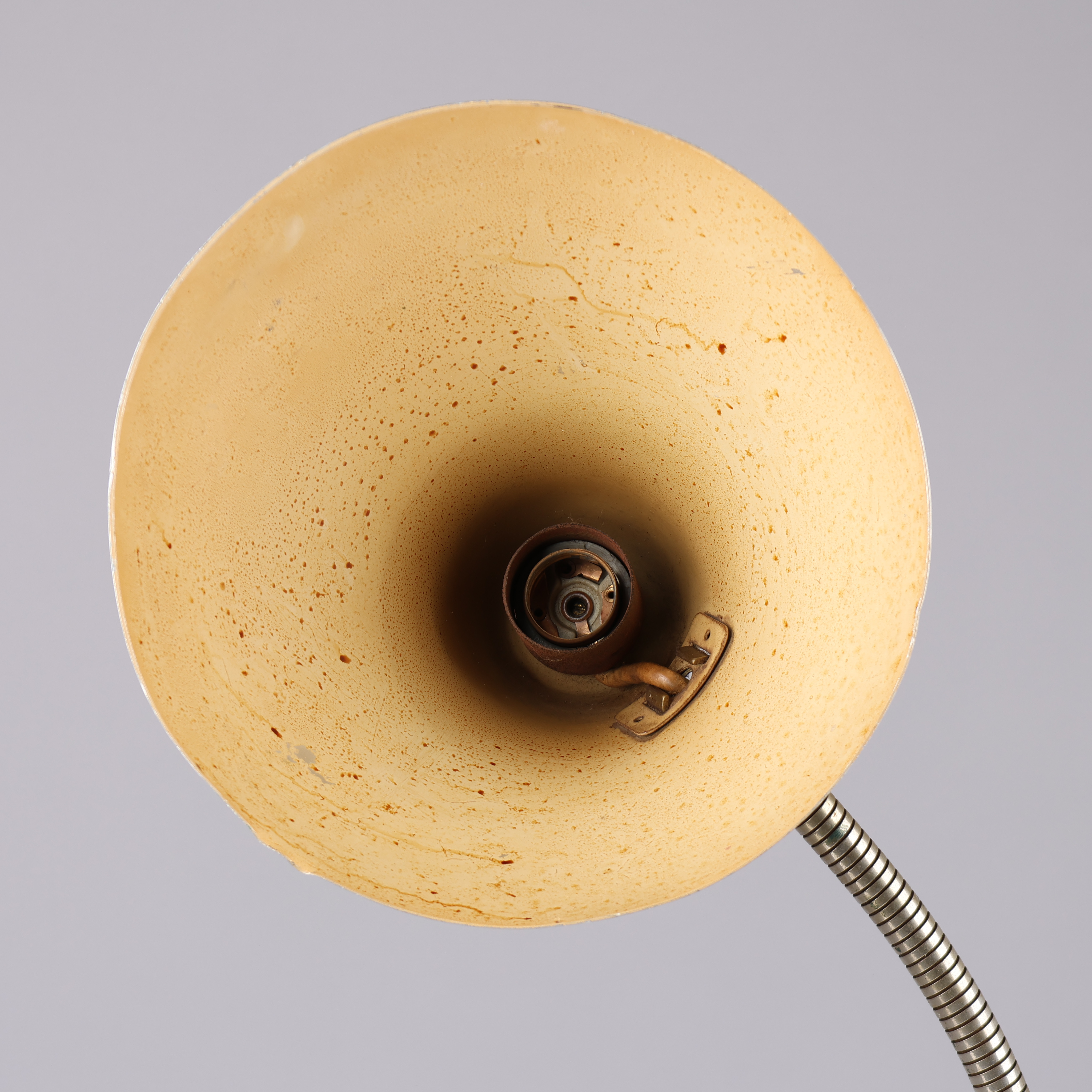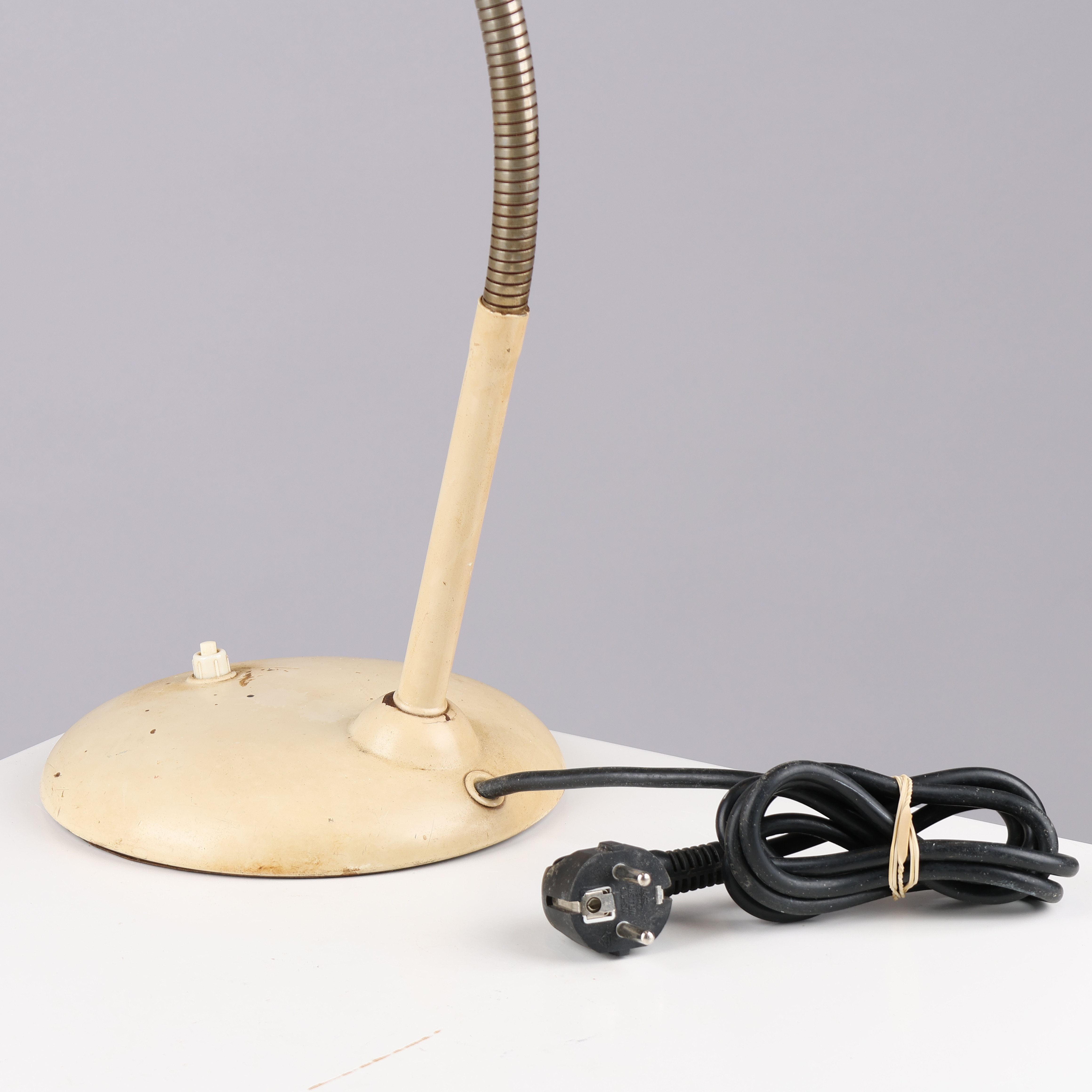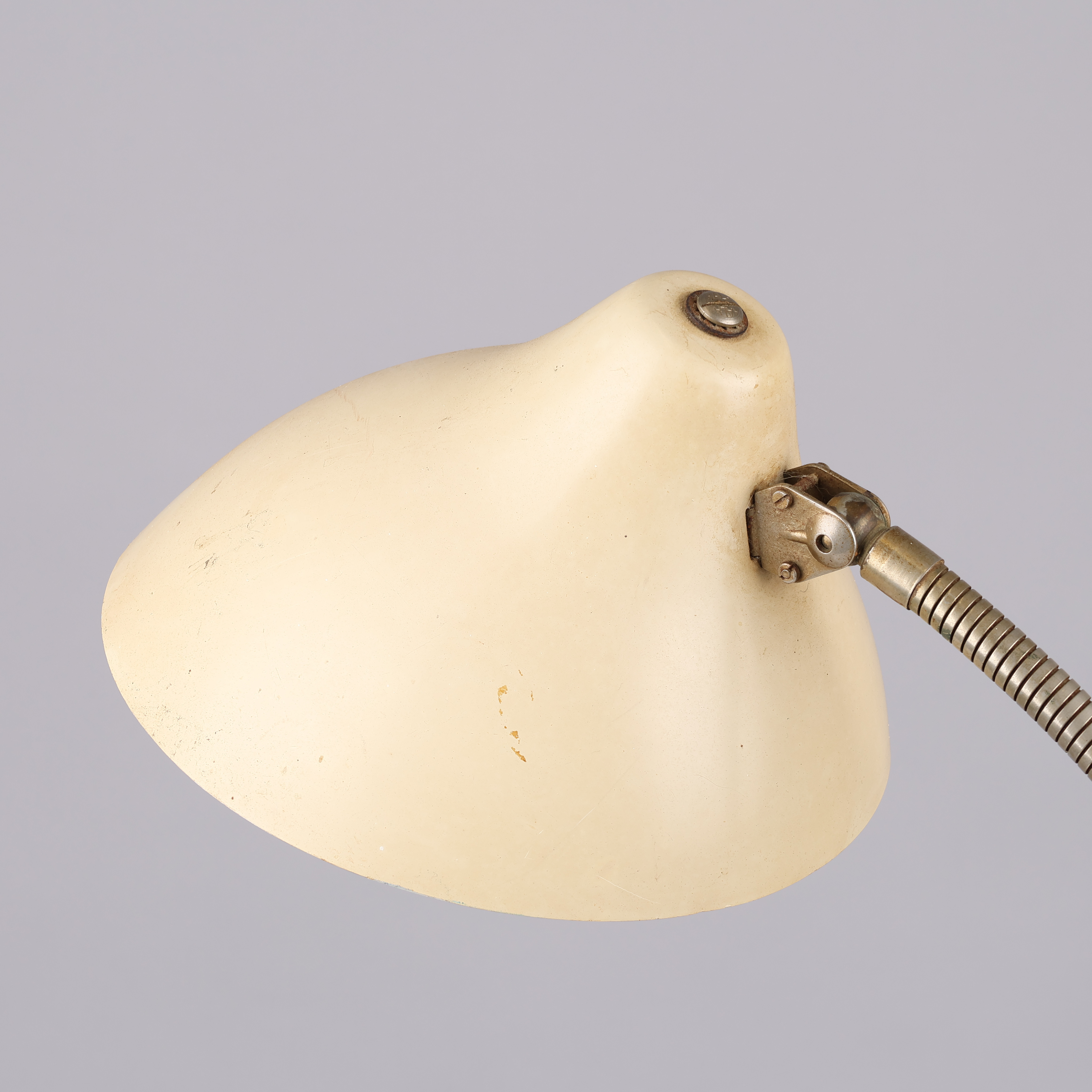 4458603. Säädettävä Bauhaus-tyylinen pöytävalaisin jalustalla ja näytöllä valkoisella lakatulla metallilla, joustava varsi, Hala, 1900-luku.