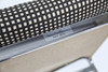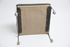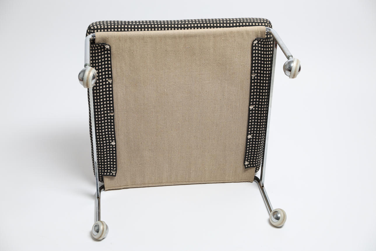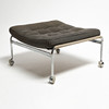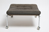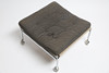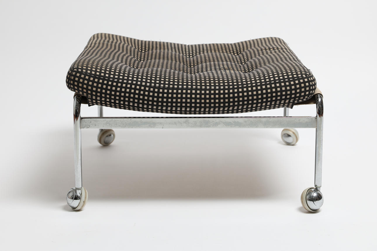 Kromattu teräs jalkateline pyörillä, pehmustettu tyyny. Musta/valkoinen verhoilu. Etiketin merkintä. 65x65 cm, korkeus 38 cm.