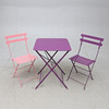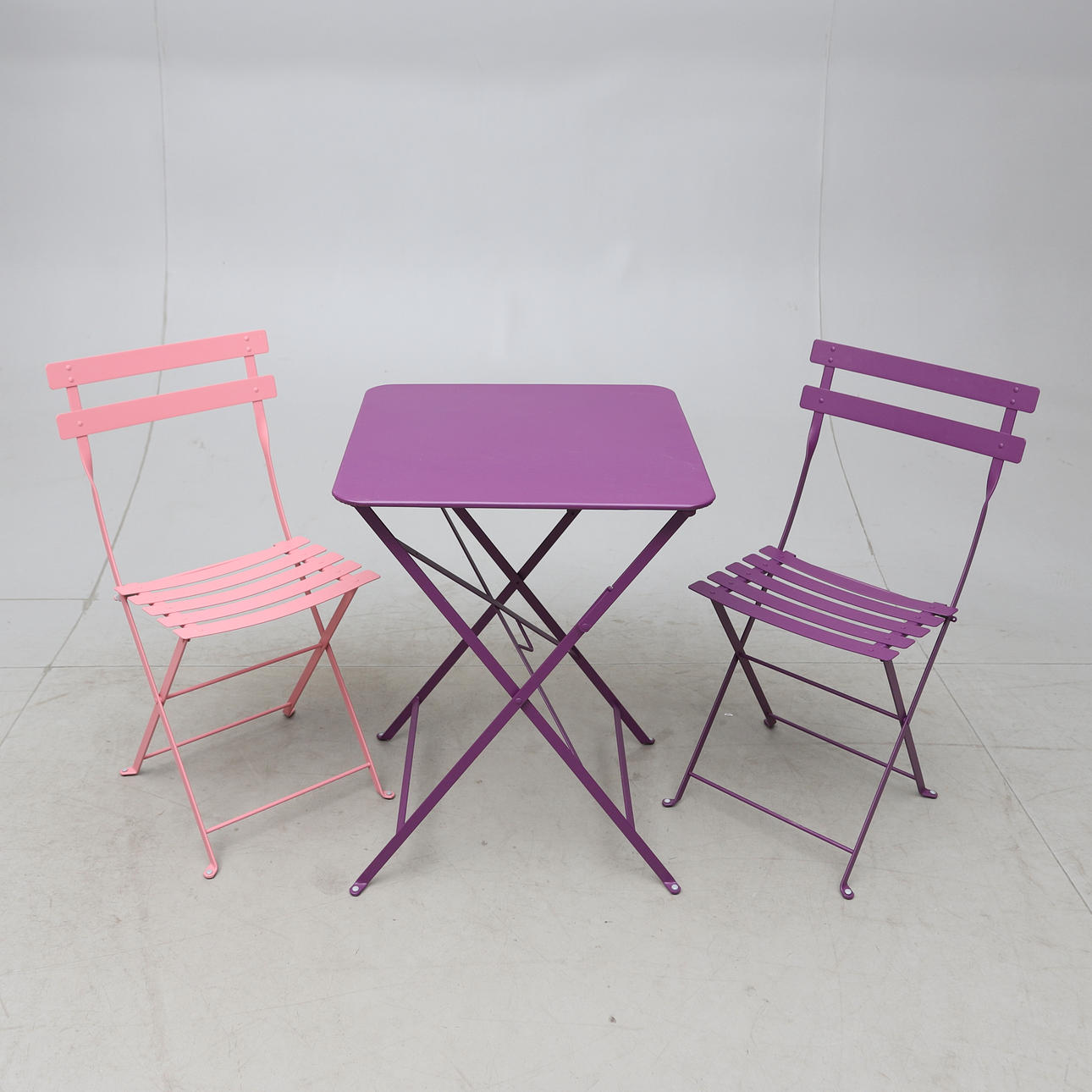 Lakattu metalli. Kokoontaitettava. Pöytä n. 57x57, korkeus 75 cm. 2 tuolia, korkeus n. 82 cm.
