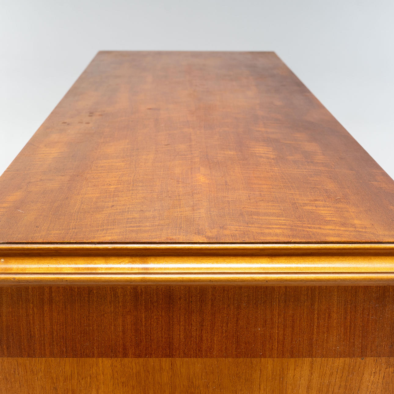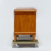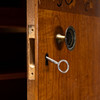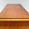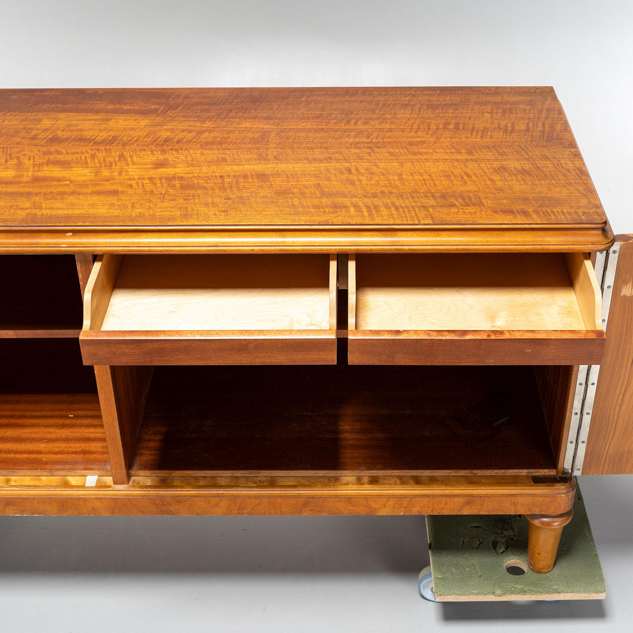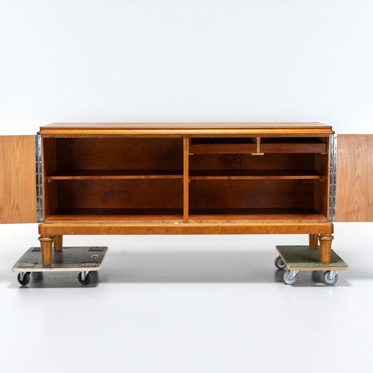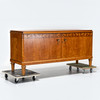 Viilutettu mm. koivulla. Intarsia-sisustus, Kaksi ovea takahyllyillä ja laatikoilla.