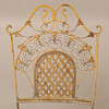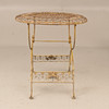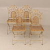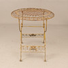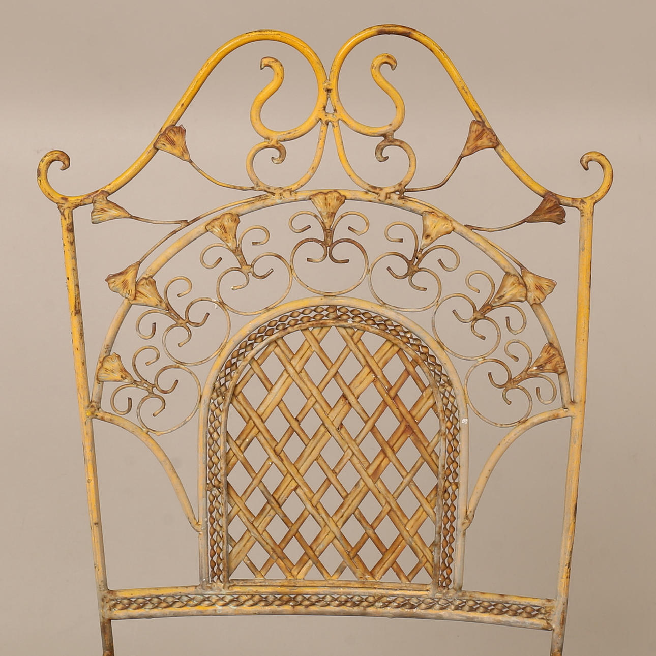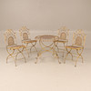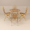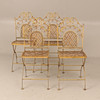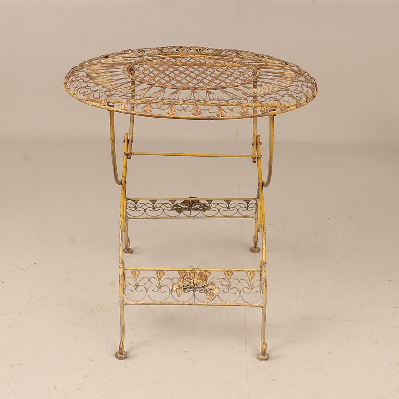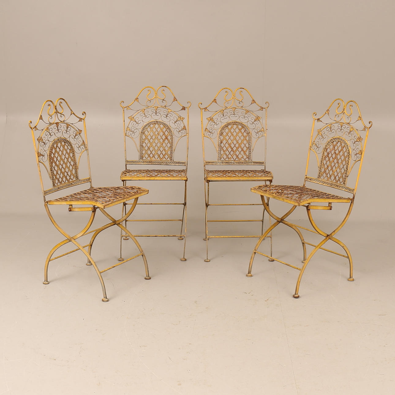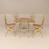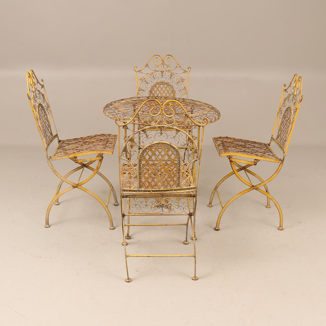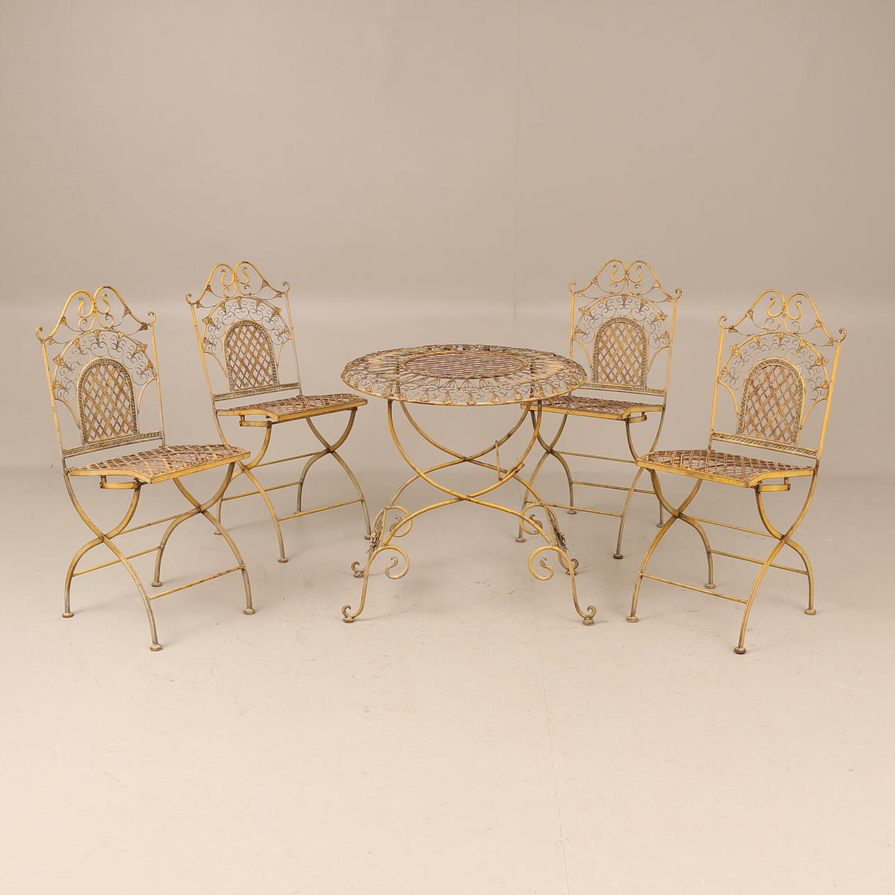 Pöytä, taitettava, korkeus n. 74 cm, halkaisija n. 74 cm. 4 tuolia, taitettava, korkeus n. 96 cm, istuinkorkeus n. 51 cm, leveys noin 44 cm.