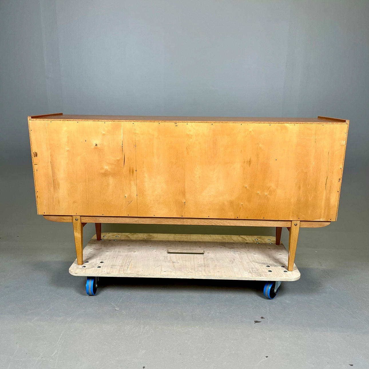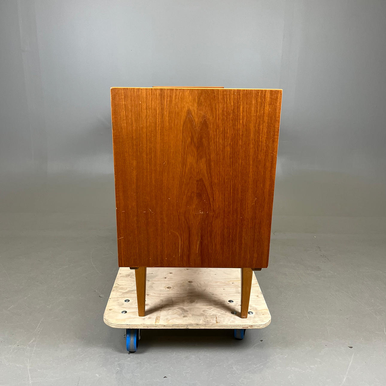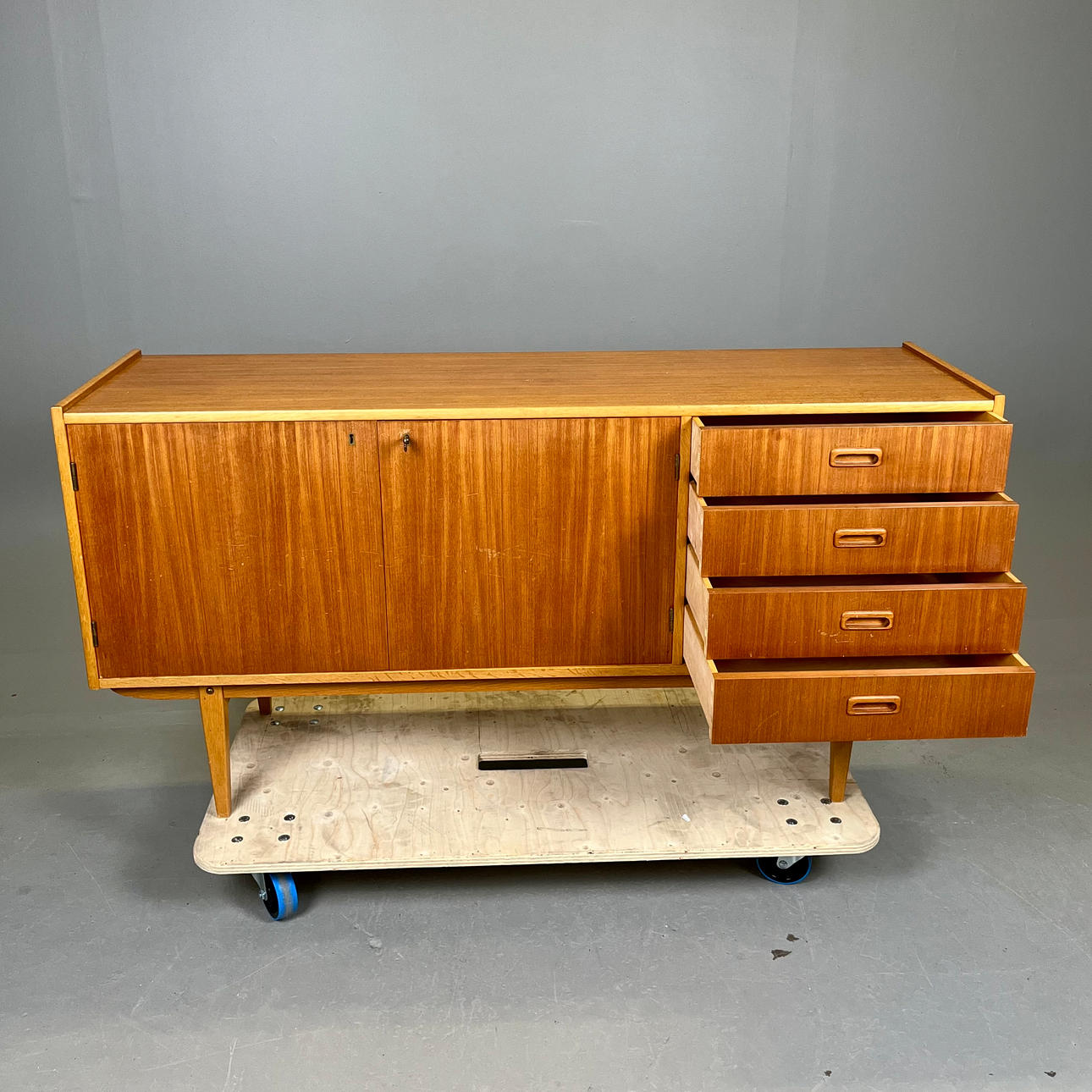 Teak ja tammi. Pituus n. 150, leveys 43, korkeus 77 cm.