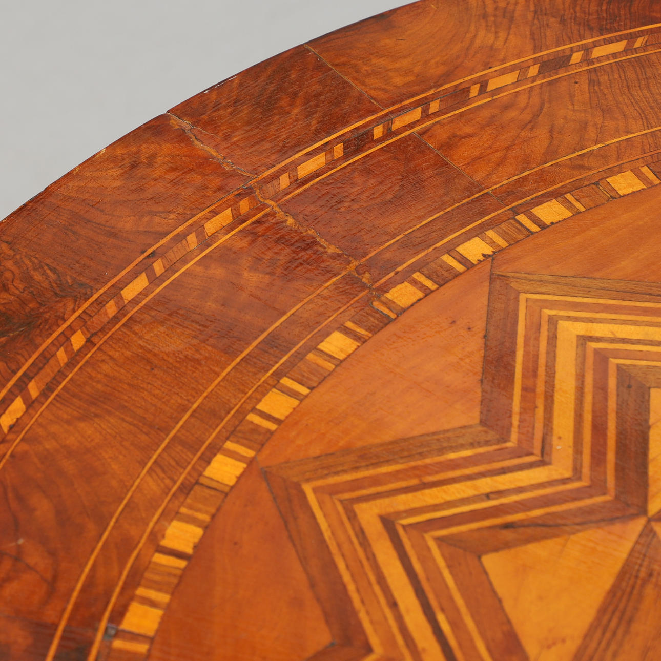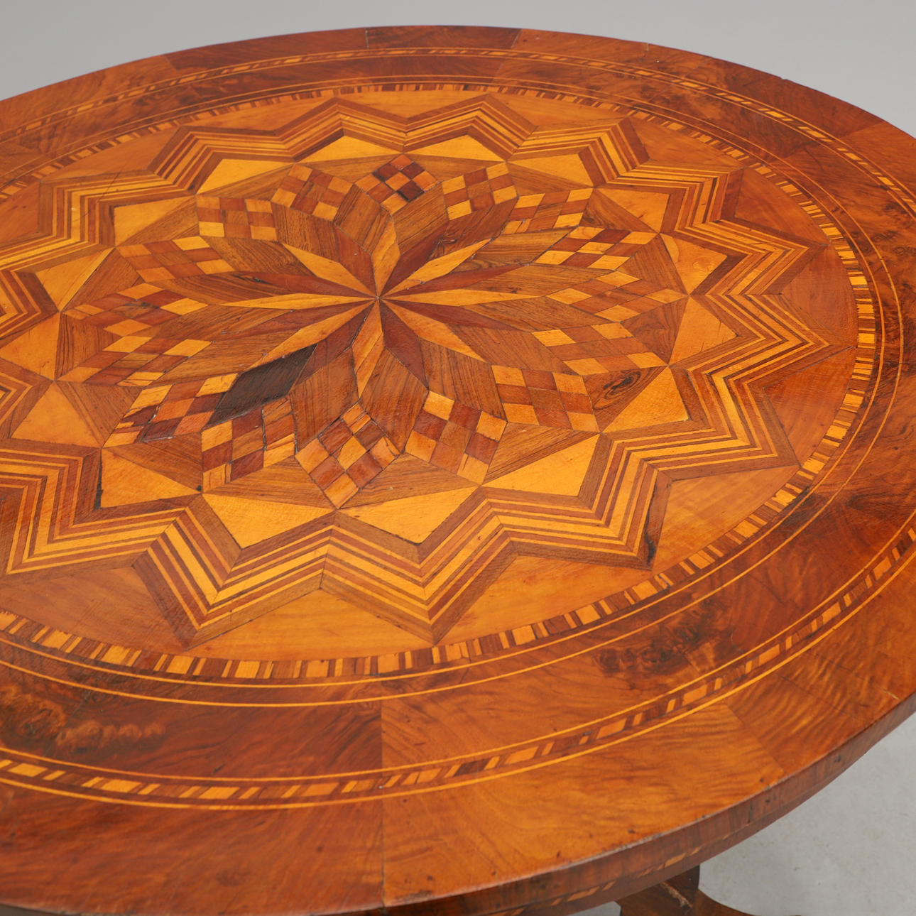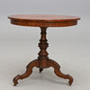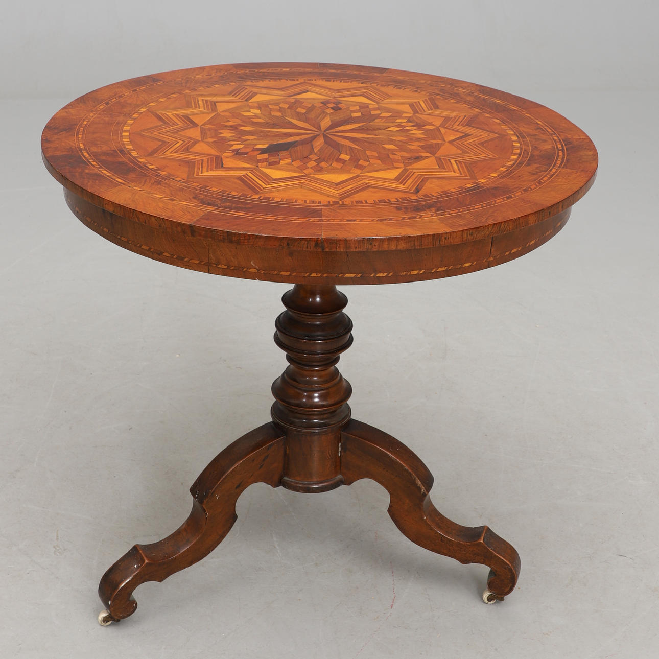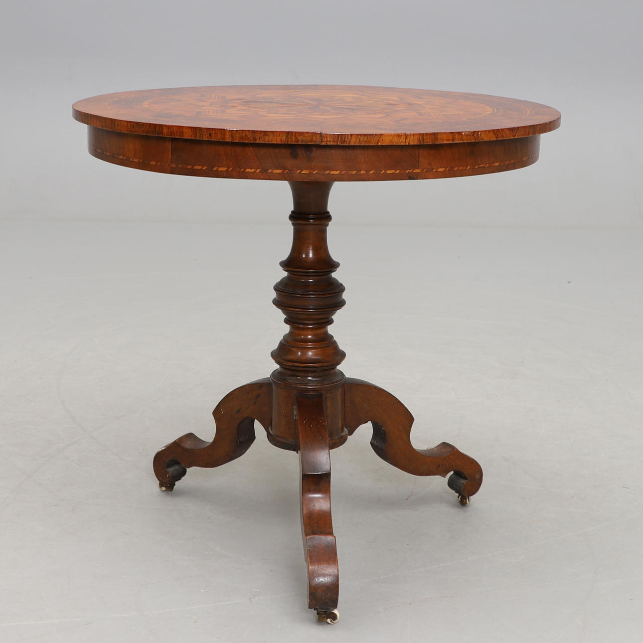 Pyöreä levy intarsia-sisustuksella. Kolmiosainen keskijalka karuselleilla. Halkaisija 82, korkeus 77 cm.
