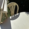6 tuolia. Pöydän pituus noin 142 cm. Korkeus n. 74 cm. Yhden levyn leveys 55.
