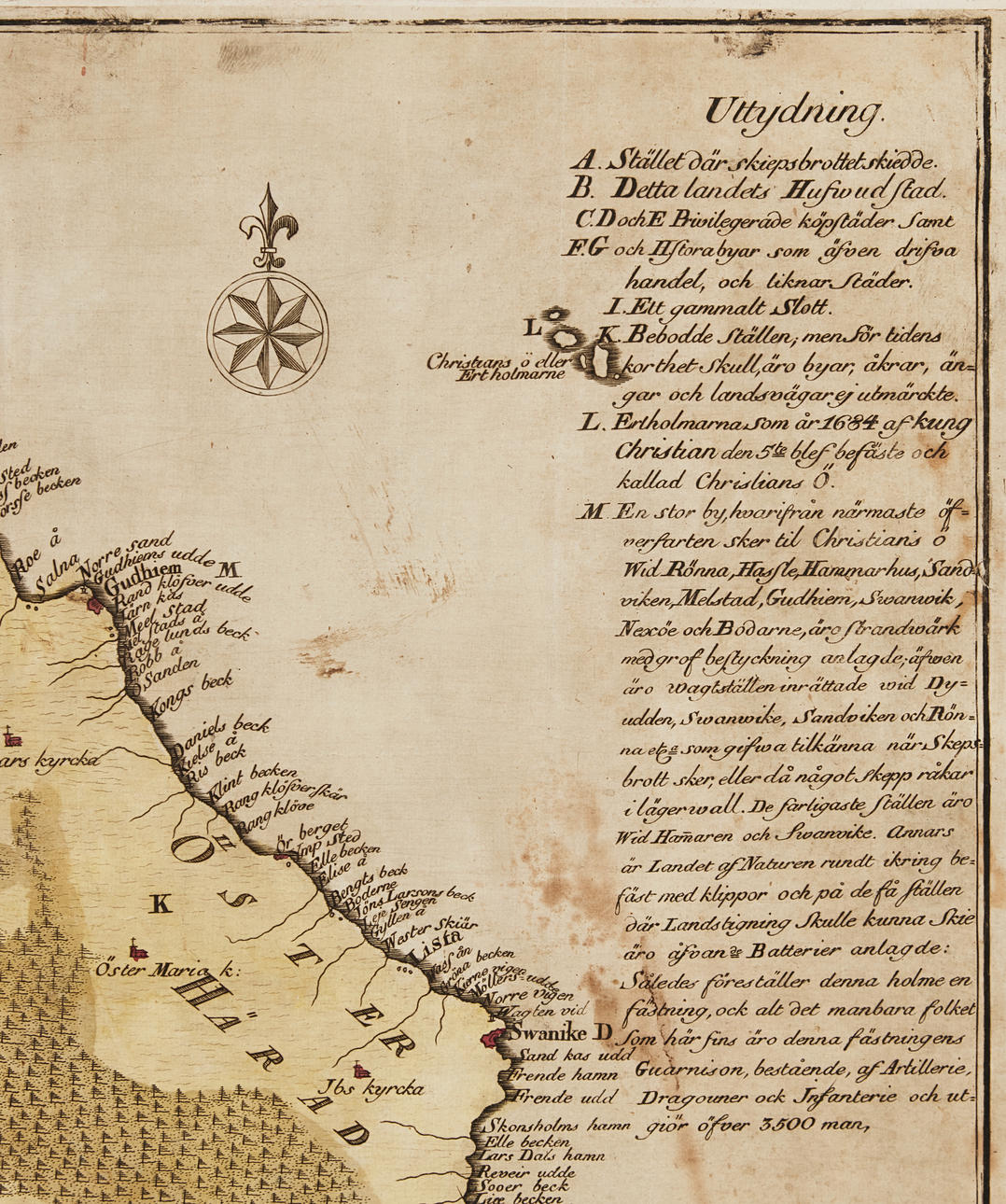 ÖSTERBERG, ERIK - CÖHLER, THURE. Charta öfwer Bornholm, Lieutnant Thure Cöhlerin käyttämä ja kuparista E Österbergin kiinnittämä 1765.