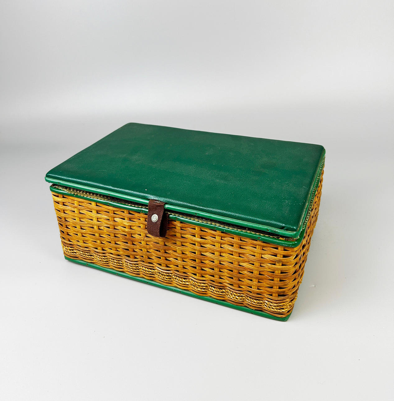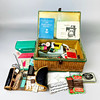 Vintage ompelulaatikko ja sisältö, laatikon koko 28 x 18 x 14 cm.