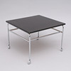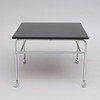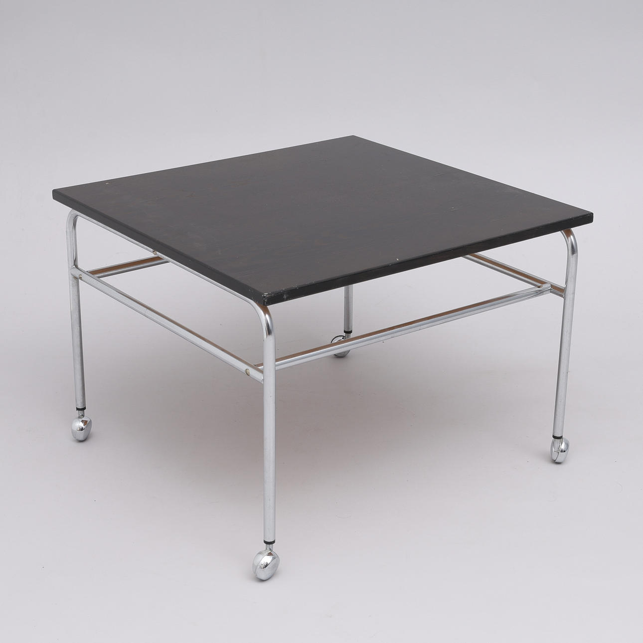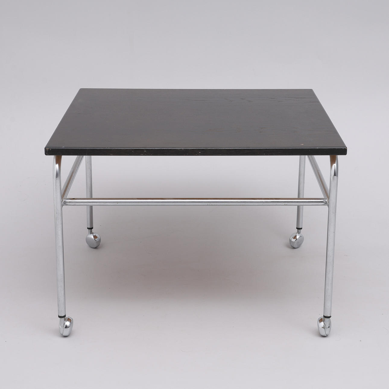 Mustaksi maalattu levy kromatulla jalkatelineellä pyörillä, korkeus 50 cm. Levyn mitat 70x70 cm.