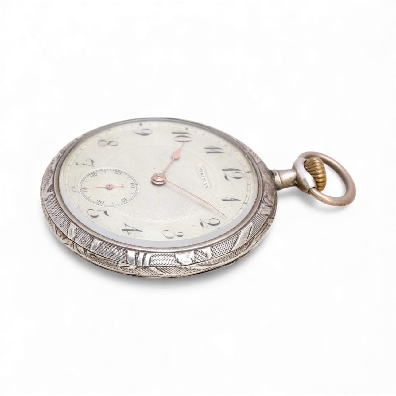49 mm hopeakotelo. Kellotaulu arabialaisella numerolla, mikrosekunti kello kuusi ja signeerattu ”Minimax”. Manuaalinen köyden liike. Takakannessa taltatut kasviaiheet ja ”Santiago” -merkintä. Samanlainen teos kansainvälisessä hienojen taskukellojen museossa (MIARB), inv. #483 JDBC. 54,8 gr.