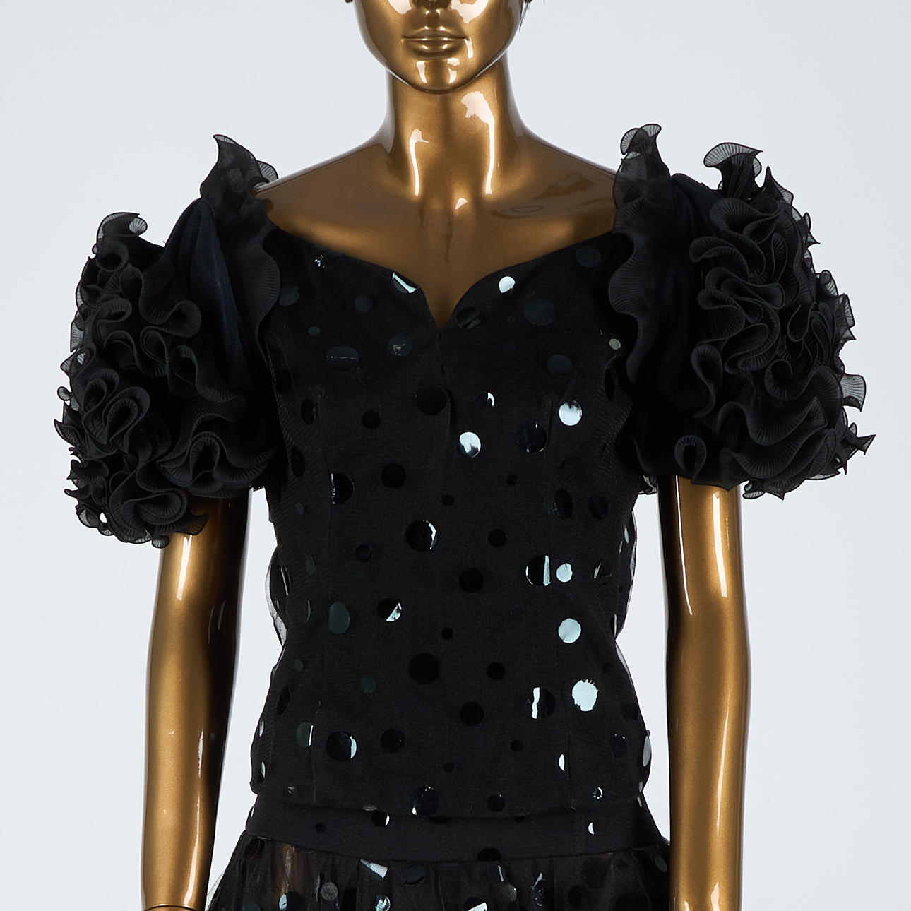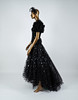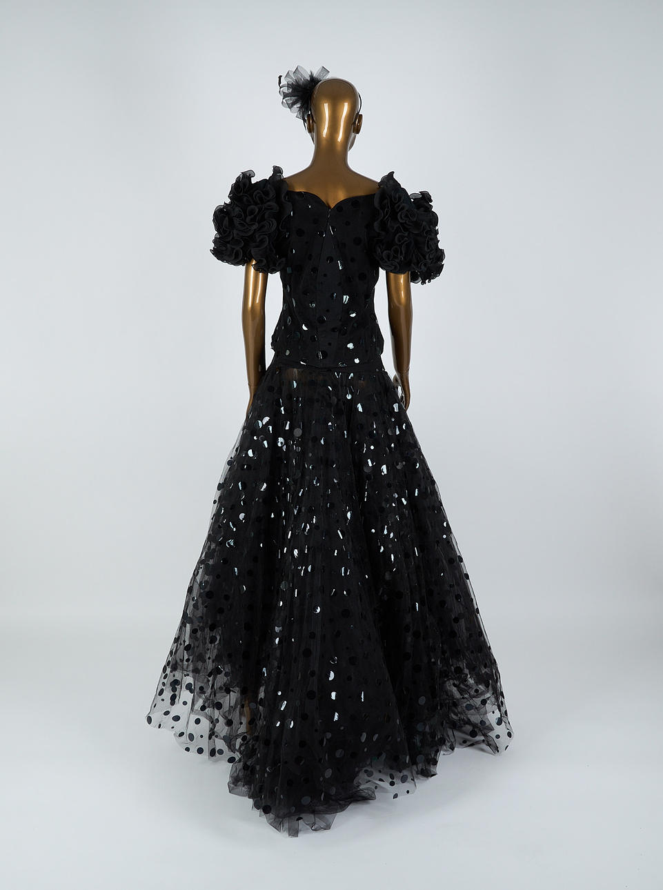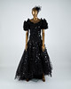 Arvioitu koko noin 38. Selän pituus 55 cm, rinta 41 cm. Hameen vyötärö 42 cm, pituus edessä noin 100 cm, takana noin 140 cm.