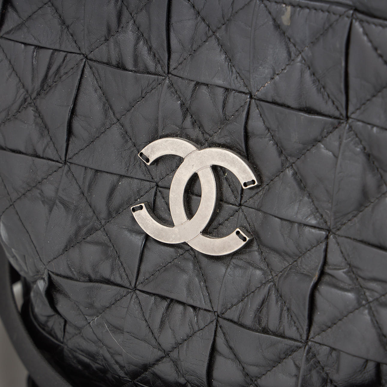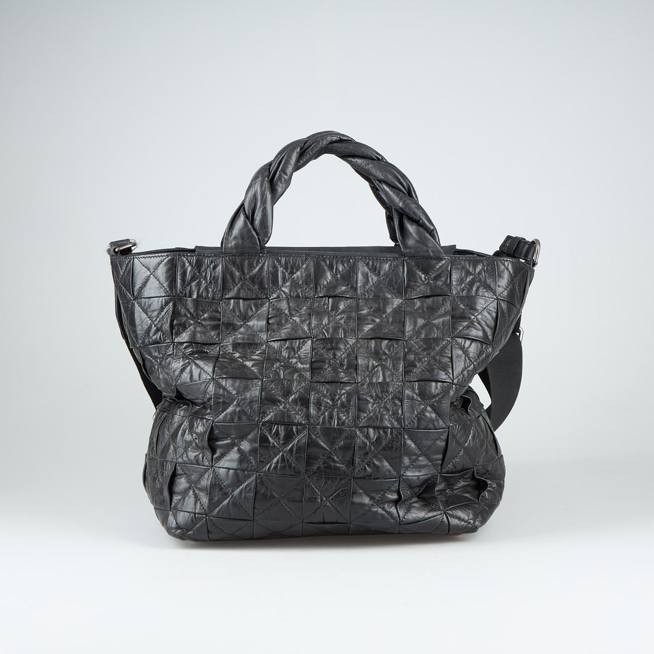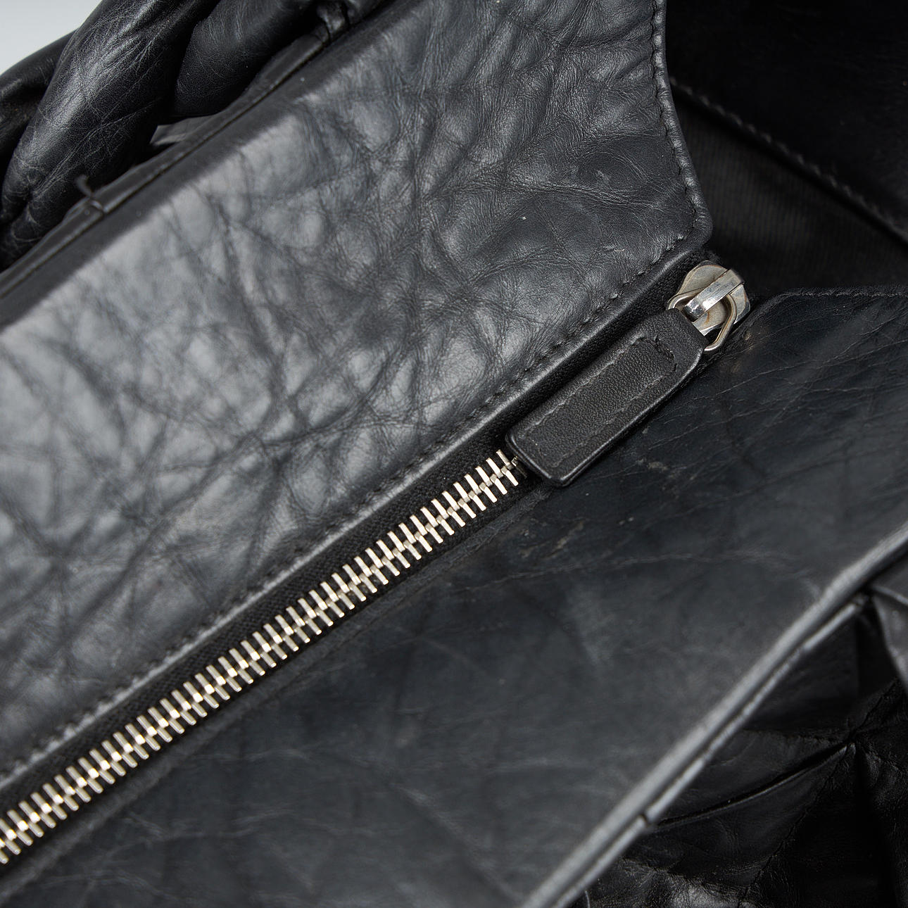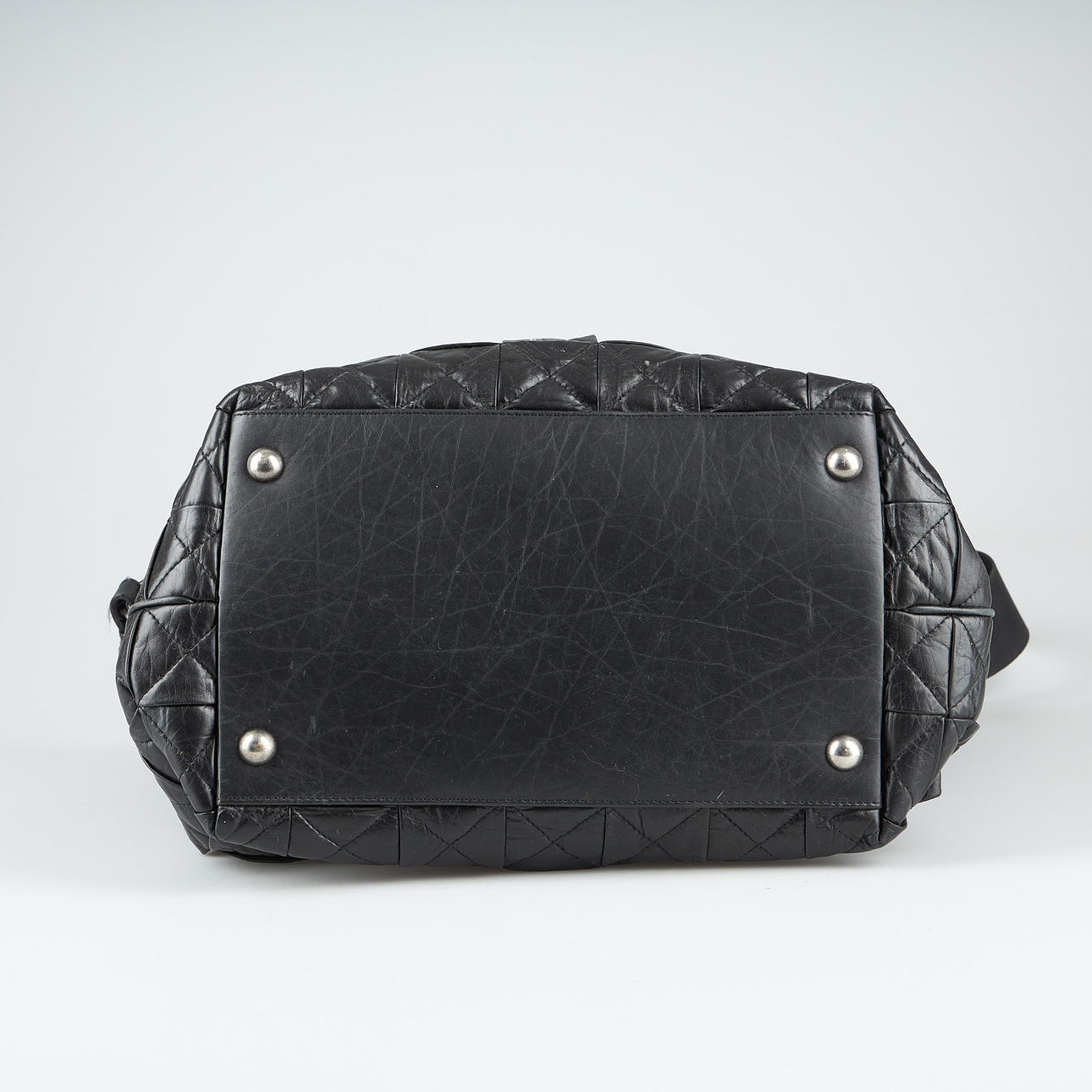 Vasikannahkaa, valkometalli, sisätaskut, sarjanumero. 28 x 42 x 20 cm. Säädettävä olkahihna yhteensä 150 cm.