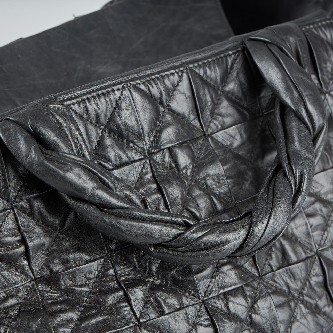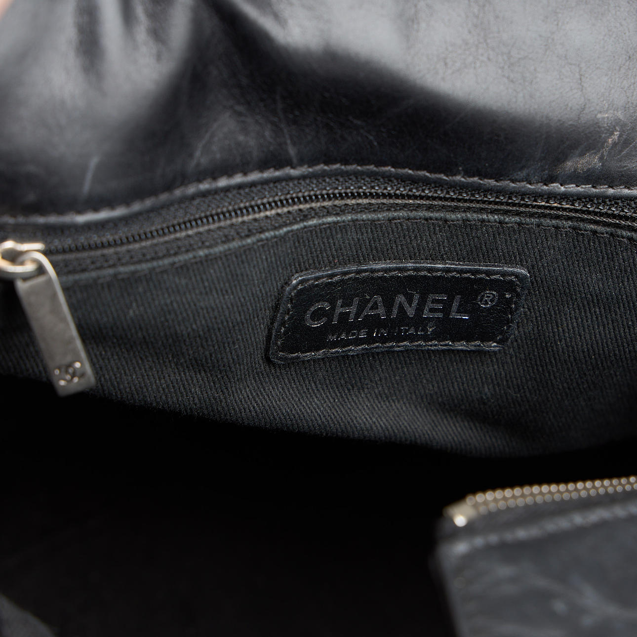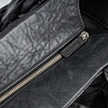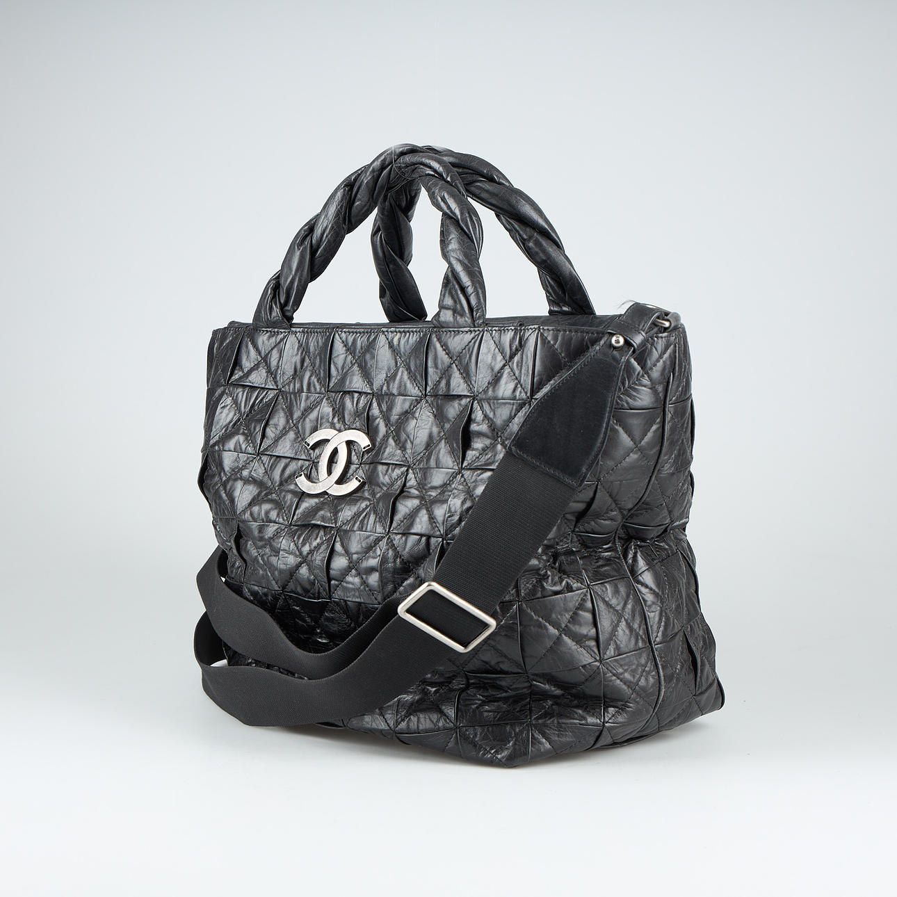 Vasikannahkaa, valkometalli, sisätaskut, sarjanumero. 28 x 42 x 20 cm. Säädettävä olkahihna yhteensä 150 cm.