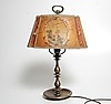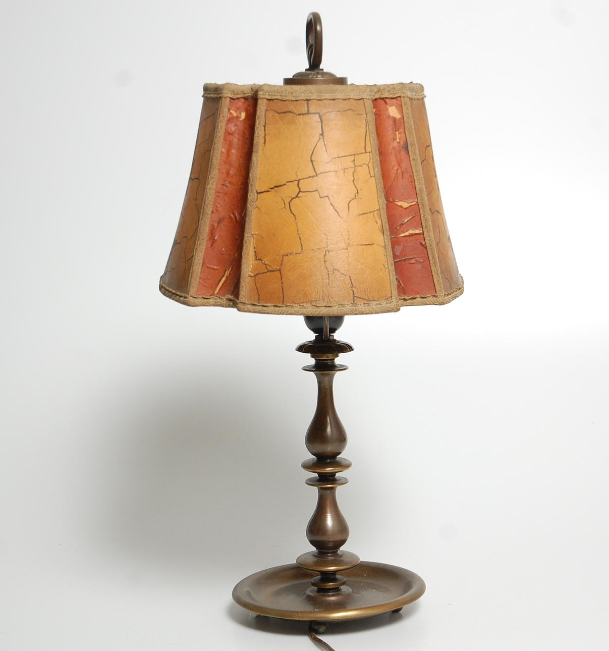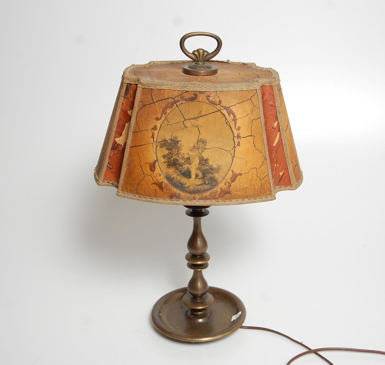 Messinkinen pöytävalaisin, pergamenttivarjostimella, korkeus 54 cm.