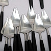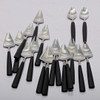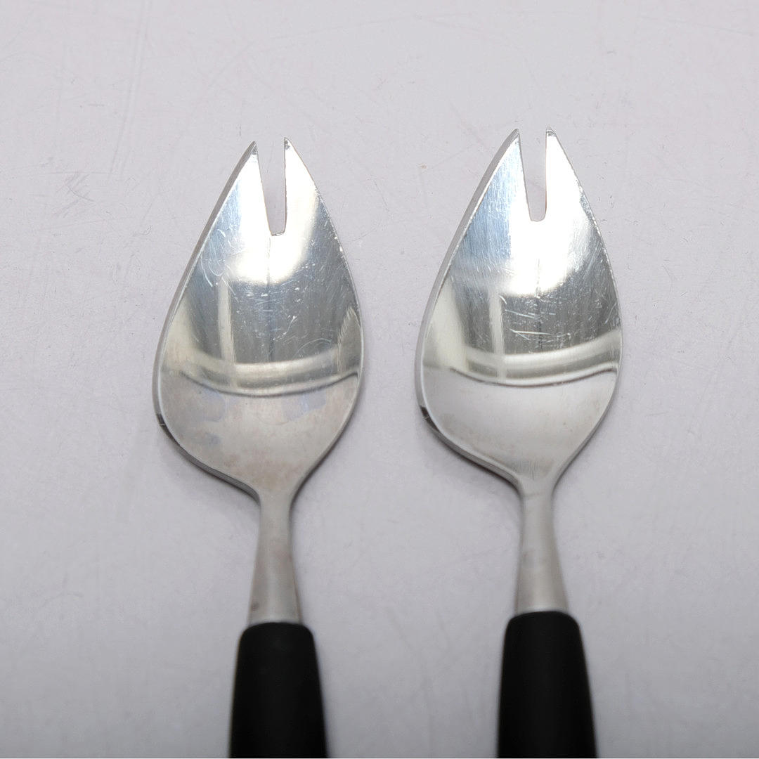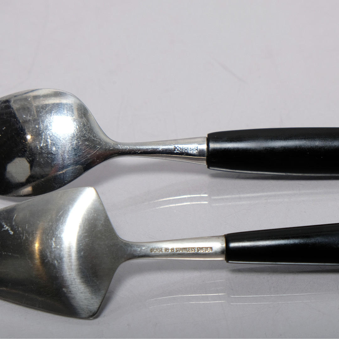 Ruostumaton teräs mustilla varsilla. 1900-luvun jälkipuoli. Ruokailuvälineiden viistetyillä sivuilla on teräviä reunoja. Merkitty Gense.