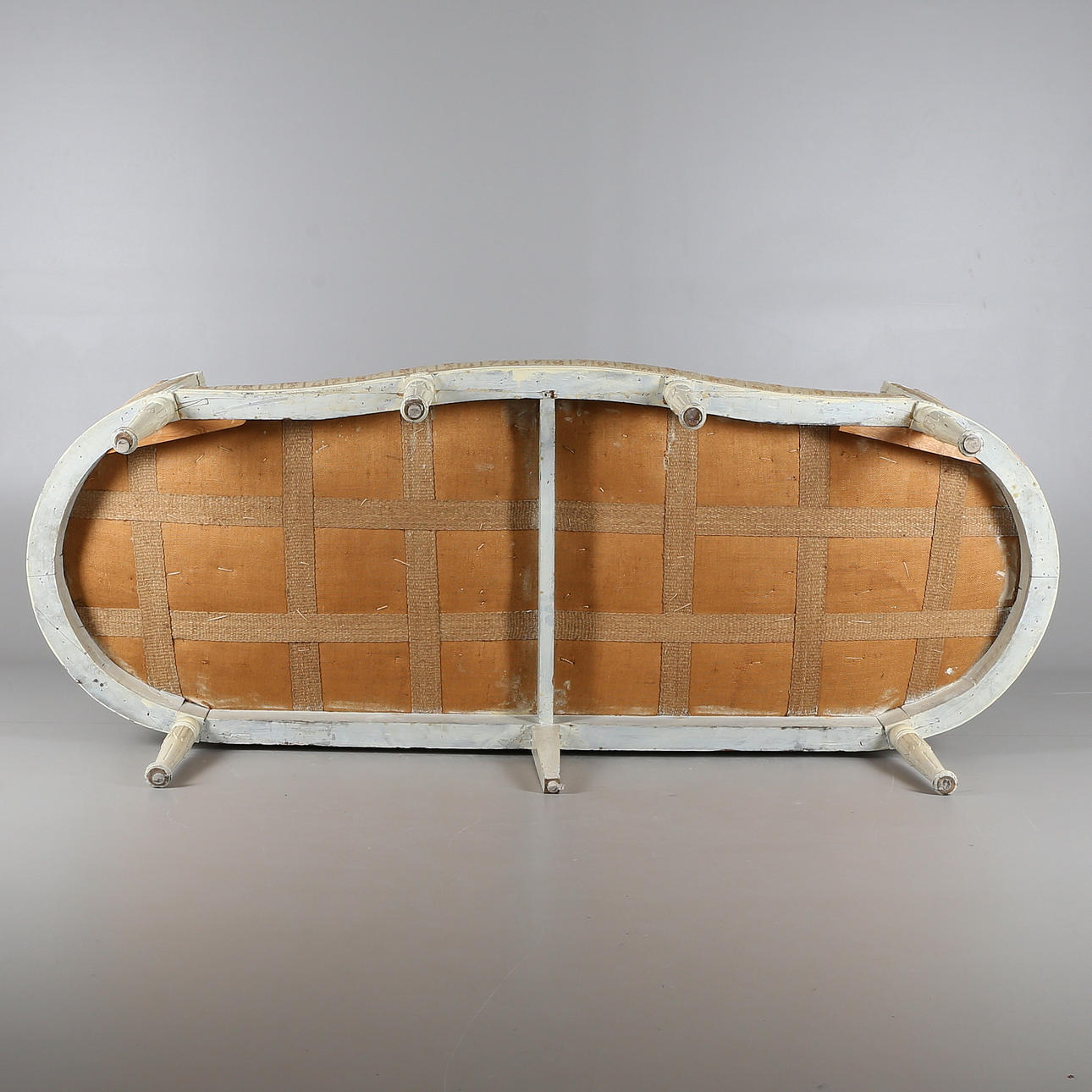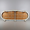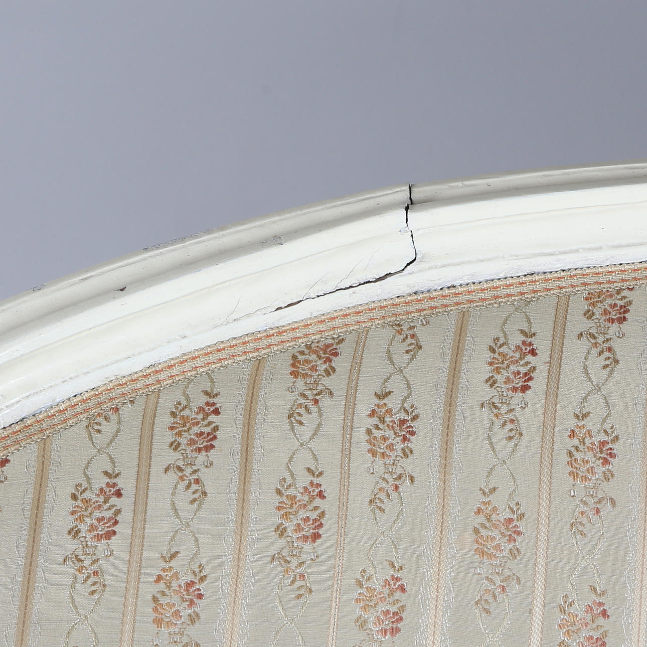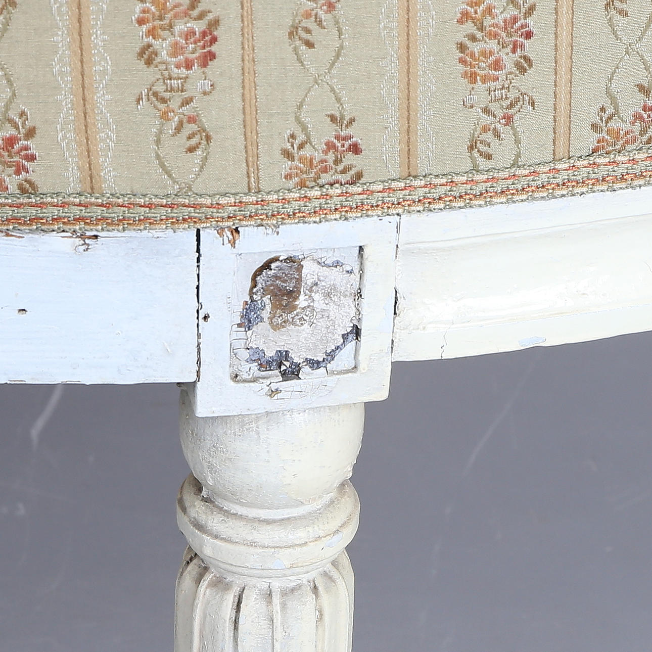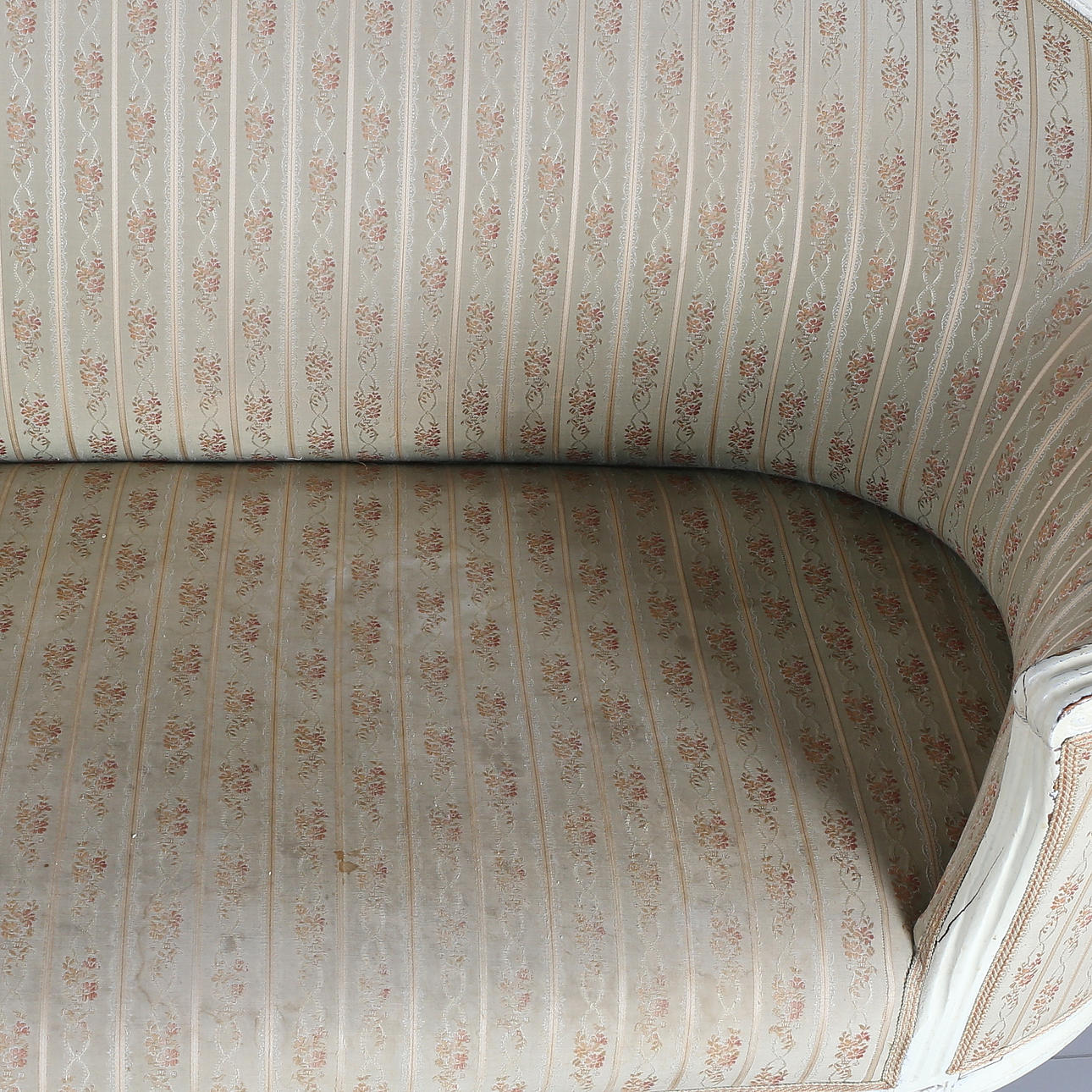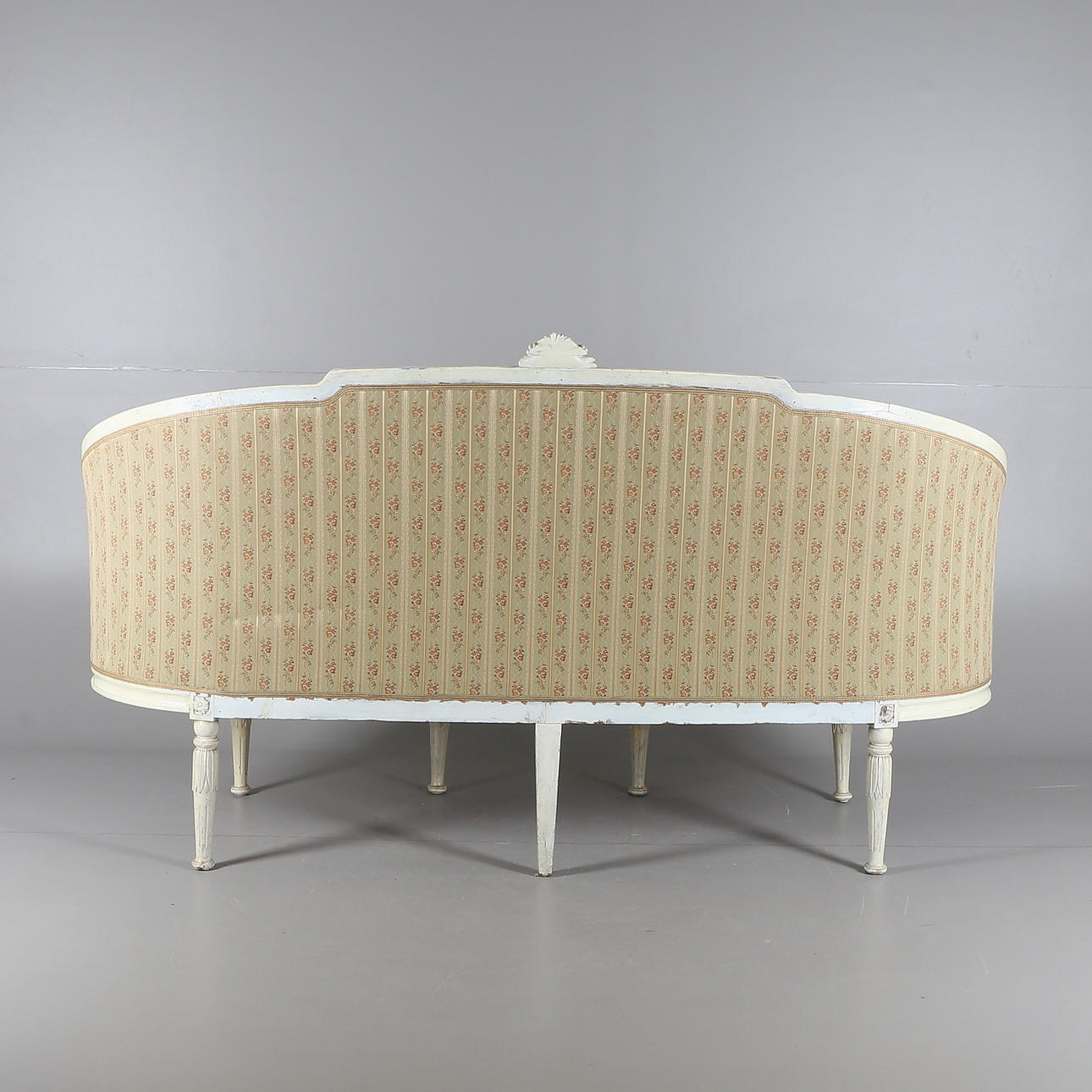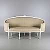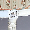 Gustaviansk. Niin kutsuttu kylpyammemalli. Kaareva pehmustettu selkänoja. draped käsinojat, suorat uurretut jalat. koristelu leikatuista ruusuista, kiinteä pehmustettu istuin.