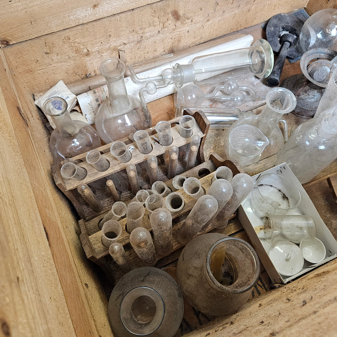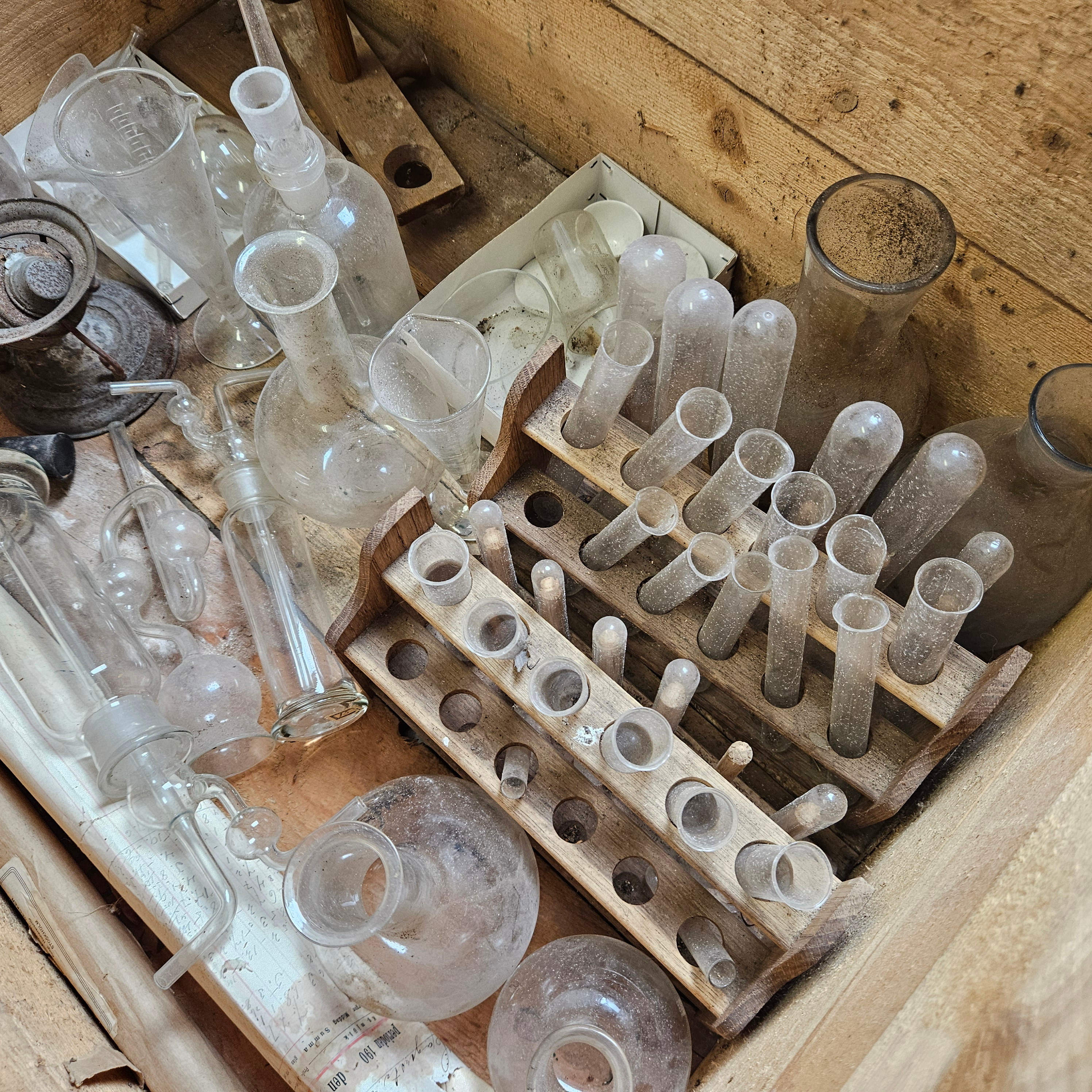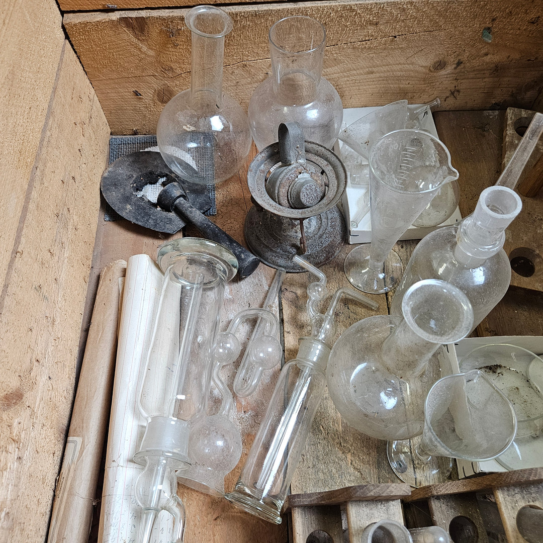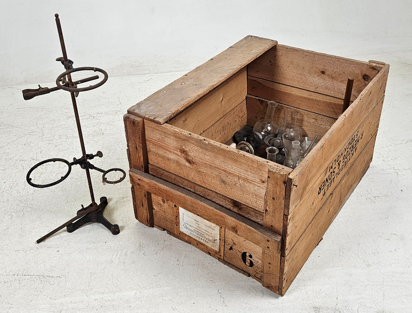 5000302. PALJON LABORATORIOLAITTEITA, puulaatikossa.
