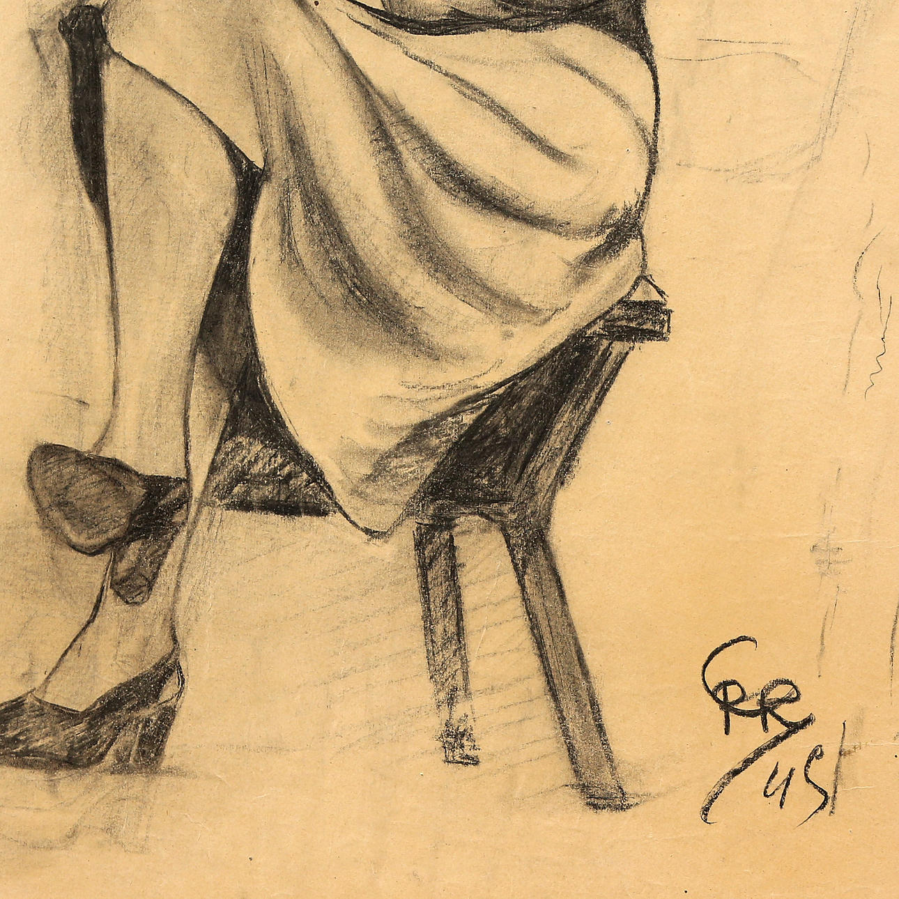 Hiilipiirros paperilla, liimattu táblex-levylle.