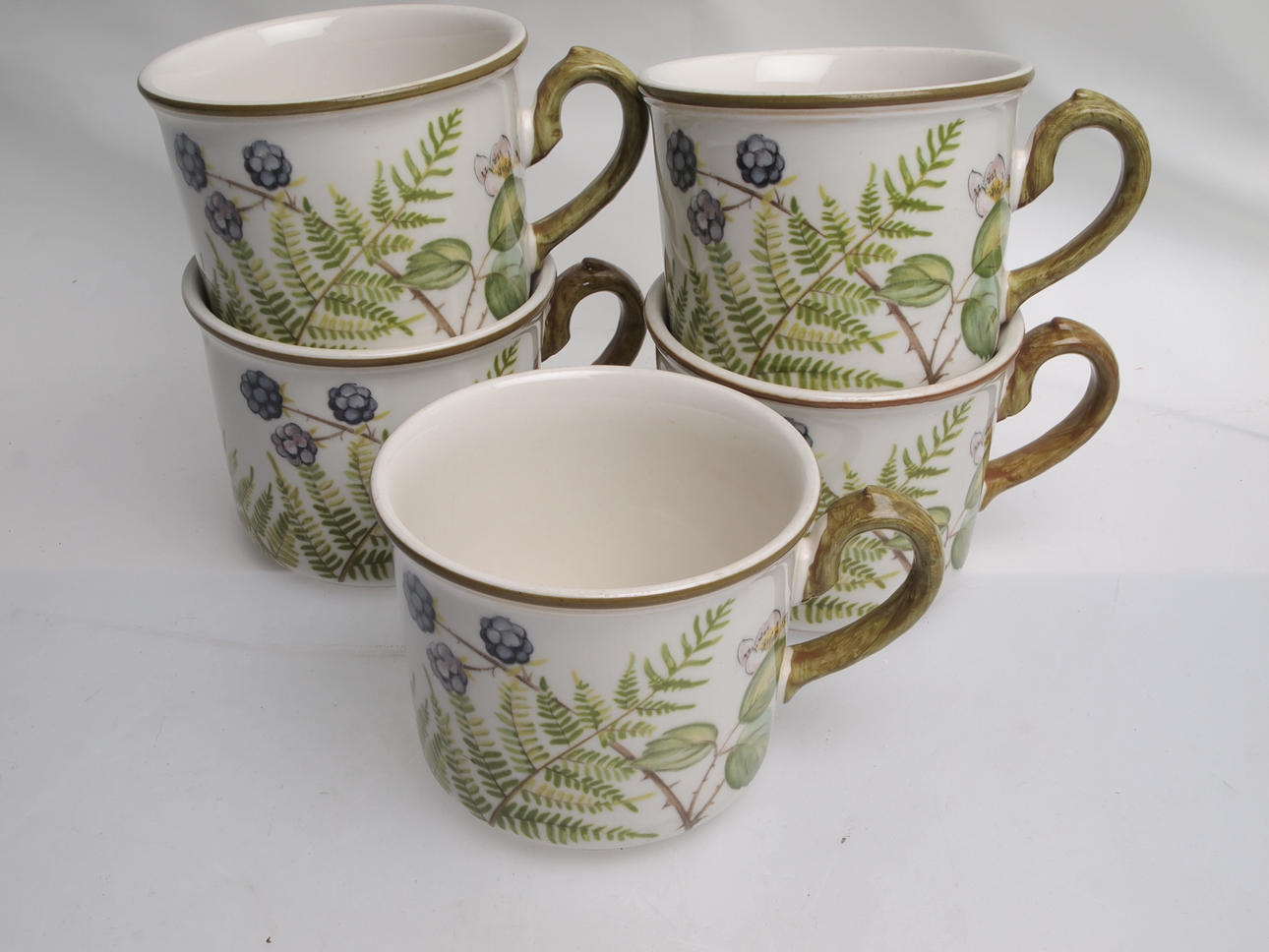 9 lautasta halkaisijaltaan 24 cm, 7 lautasta halkaisijaltaan 21 cm, 2 liemikuppia ja lautasia, joiden halkaisija on 12 cm ja korkeus 5 cm, liemilautanen halkaisija 17 cm, marmeladipurkki halkaisija 11 cm ja korkeus 11 cm ( kansi kanssa) , kermakannu 8, 5 cm korkea, 5 kahvikuppia ja lautanen 7 cm korkea, 8 cm halkaisija lautanen 15 cm halk. porkkana ilman kansi 33 cm pitkä. Sisustus karhunvatukoista.