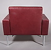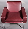 "AP 34" nojatuoli. Punaruskea "Elmo Balique" -nahkaverhoilu (täydennetty.). Neljällä teräsjalalla. Vedon jälkeen n. 1960 Valmistaja AP-Stolen, Tanska, luultavasti 1960-luvulla.