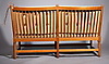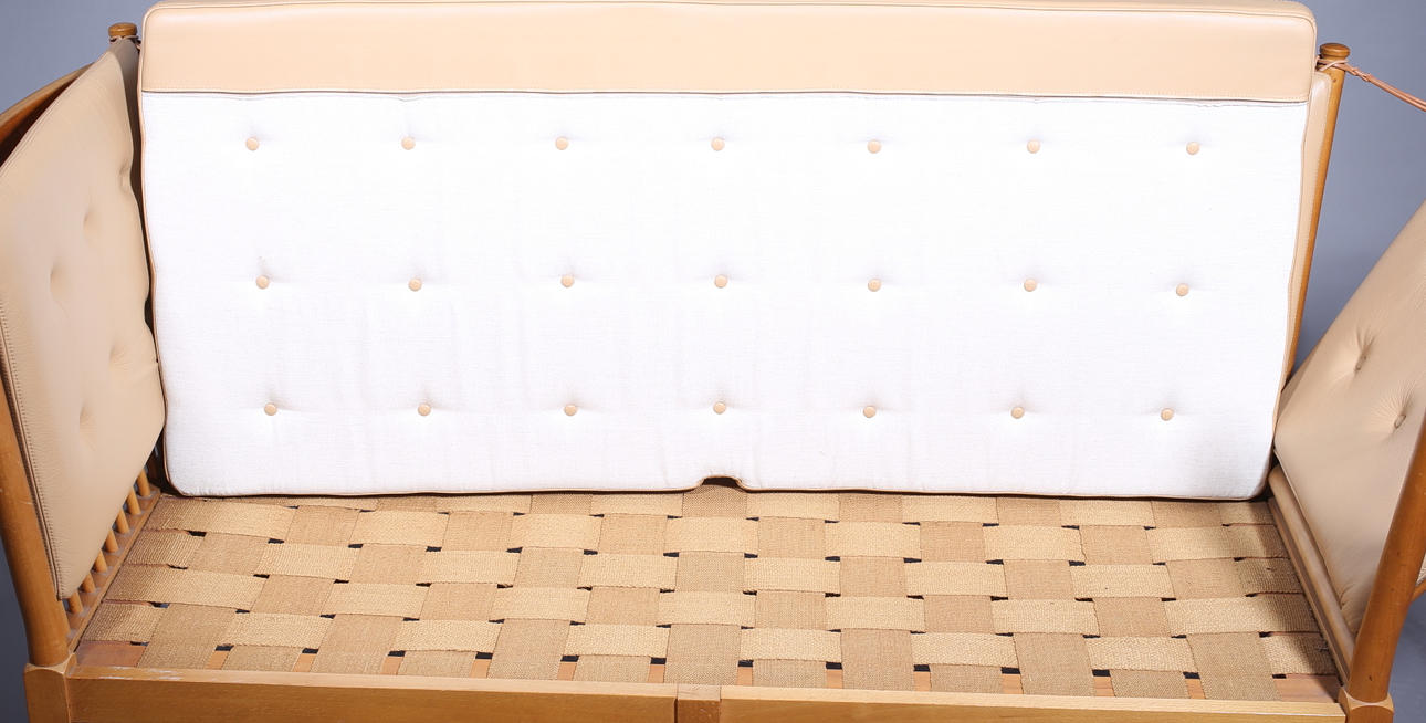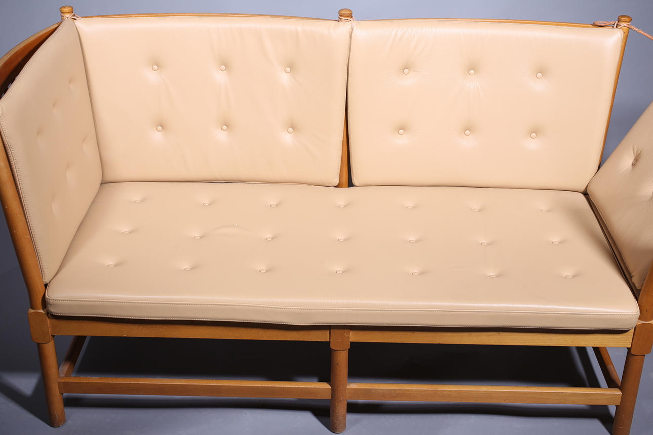 Pyökkirunko konjakinvärisellä nahkaverhoilulla (irrotettava) ja taitettavalla sivupaneelilla. Hyvä kunto. Perustuu vuoden 1945 malliin. Tuottaja Fritz Hansen tai tanskalainen Fredericia A/S, 1900-luku.